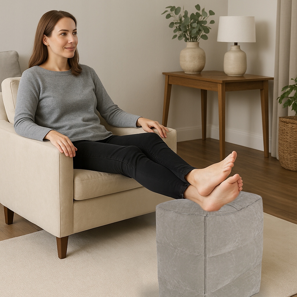 Регулировка высоты 15/30/45 см позволяет подогнать пуф под ваш рост и положение сиденья. Более высокий уровень помогает разгрузить ноги при длительном сидении, нижний уровень хорошо работает в кресле или на диване. Широкое основание 42 × 28 см обеспечивает устойчивость, а форма способствует естественному положению ног, что обеспечивает удобство и более длительный и комфортный отдых.