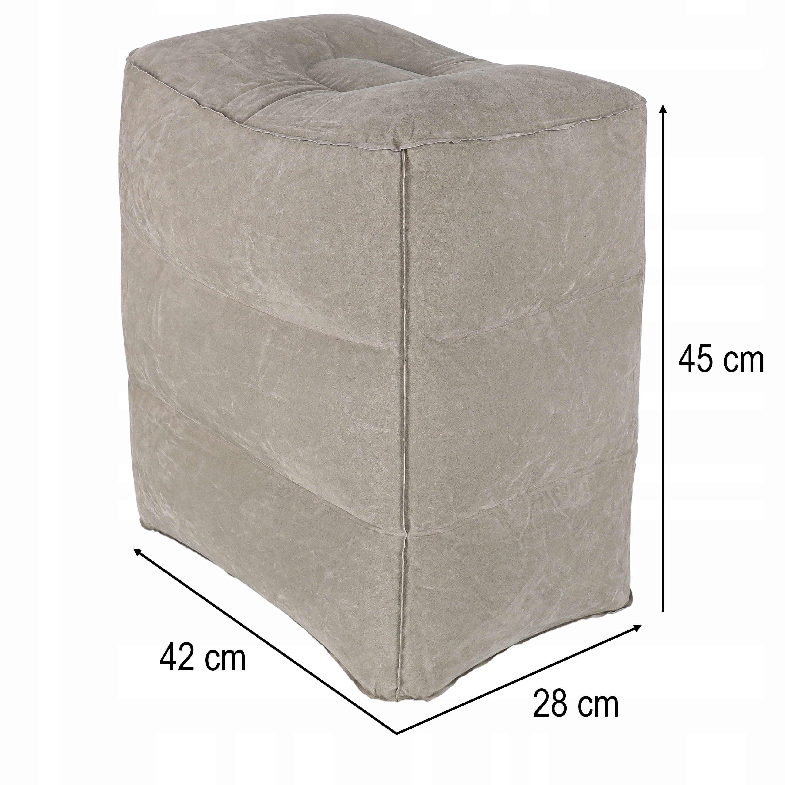Накачивание происходит быстро благодаря насадке 14 мм, совместимому с насосами для матрасов, мячей и бассейнов. Прочная поверхность из ПВХ и флокированная сочетает в себе прочность и приятность на ощупь, а грузоподъемность до 75 кг дает чувство уверенности. После сдувания пуф складывается в небольшой пакет и помещается в мешочек на шнурке, готовый к следующему путешествию
