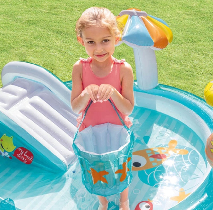 Ваш ребенок будет b>в восторге от возможности в жаркие дни освежиться в воде, скатиться с удобной горки и бросить в мишень надувное кольцо!