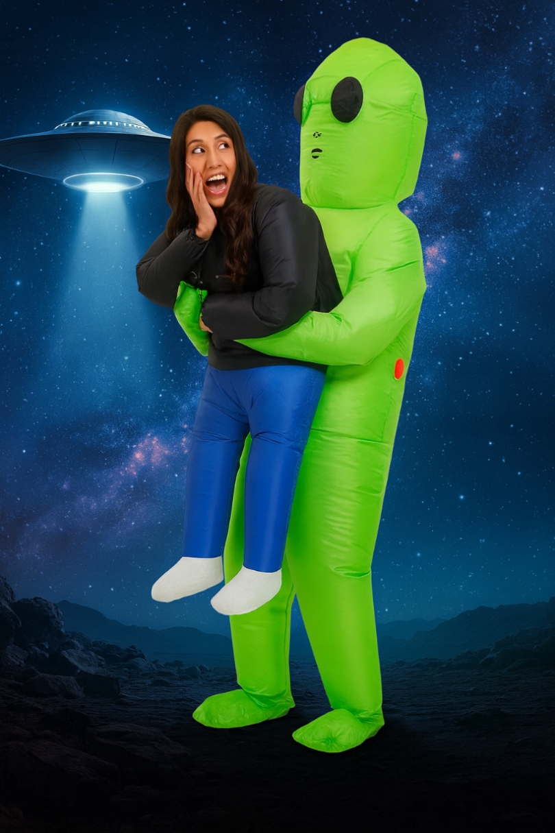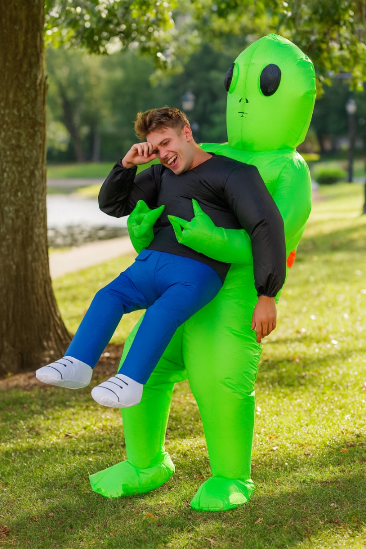 👽3D космический эффект - надувной костюм изображает зеленого инопланетянина, «поднимающего» человека, что эффектно смотрится в жизни и на фотографиях.