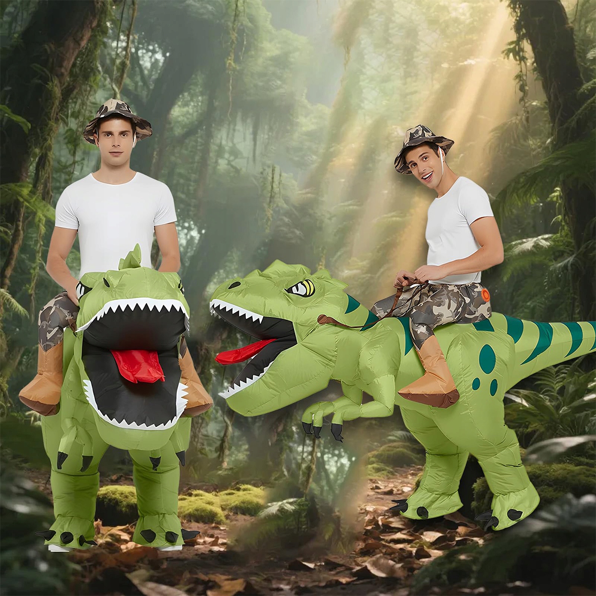 Доступен полный набор костюмов динозавра, включая основной костюм ТИРАННОЗАВРА РЕКСА и соответствующую камуфляжную шляпу. Все необходимое для полной трансформации динозавра — в одном удобном пакете.