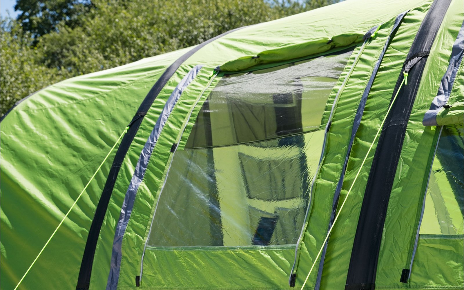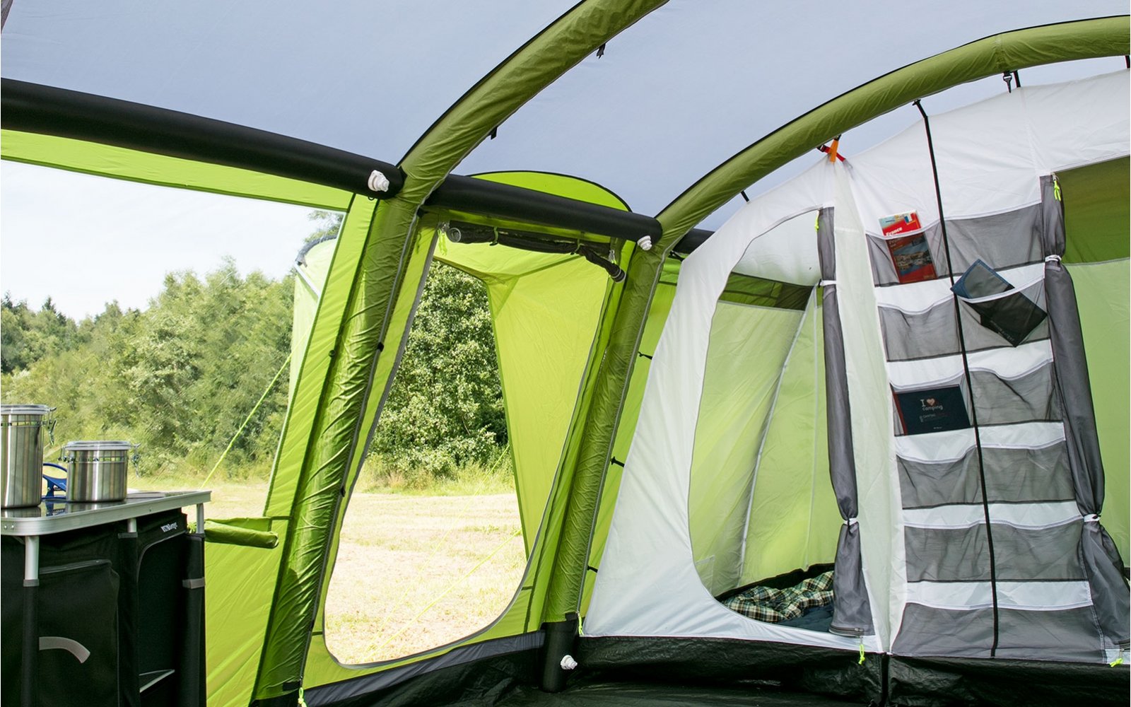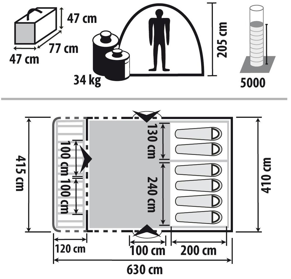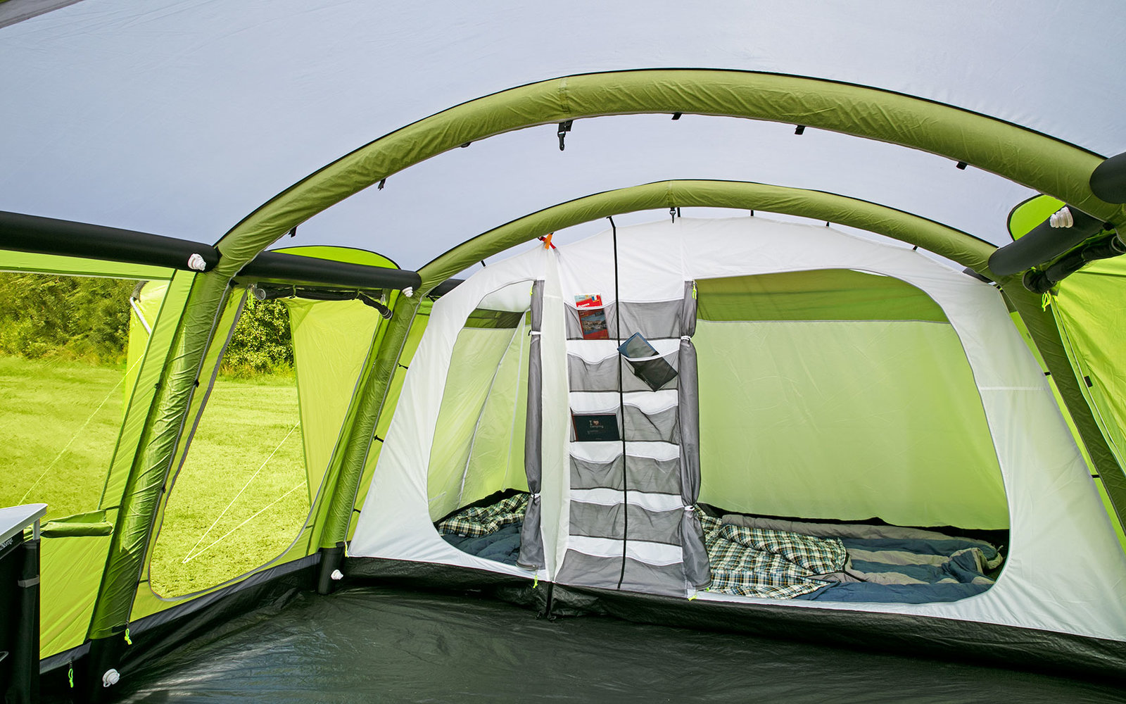 Вместимостью до 6 человек. Создан с помощью встроенной пневматической системы за считанные минуты. Боковые вентиляционные окна обеспечивают свет внутри палатки и хорошую циркуляцию воздуха в жилом помещении. Соединение надувной крыши обеспечивает дополнительную поддержку. Крытая входная зона обеспечивает укрытие для обуви и других предметов. Пол прочно пришит к внешней палатке, что облегчает конструкцию и защищает от назойливых насекомых. Органайзер между спальными мешками помогает поддерживать палатку в порядке. Кабельный канал дает возможность использовать палаточный светильник в гостиной.