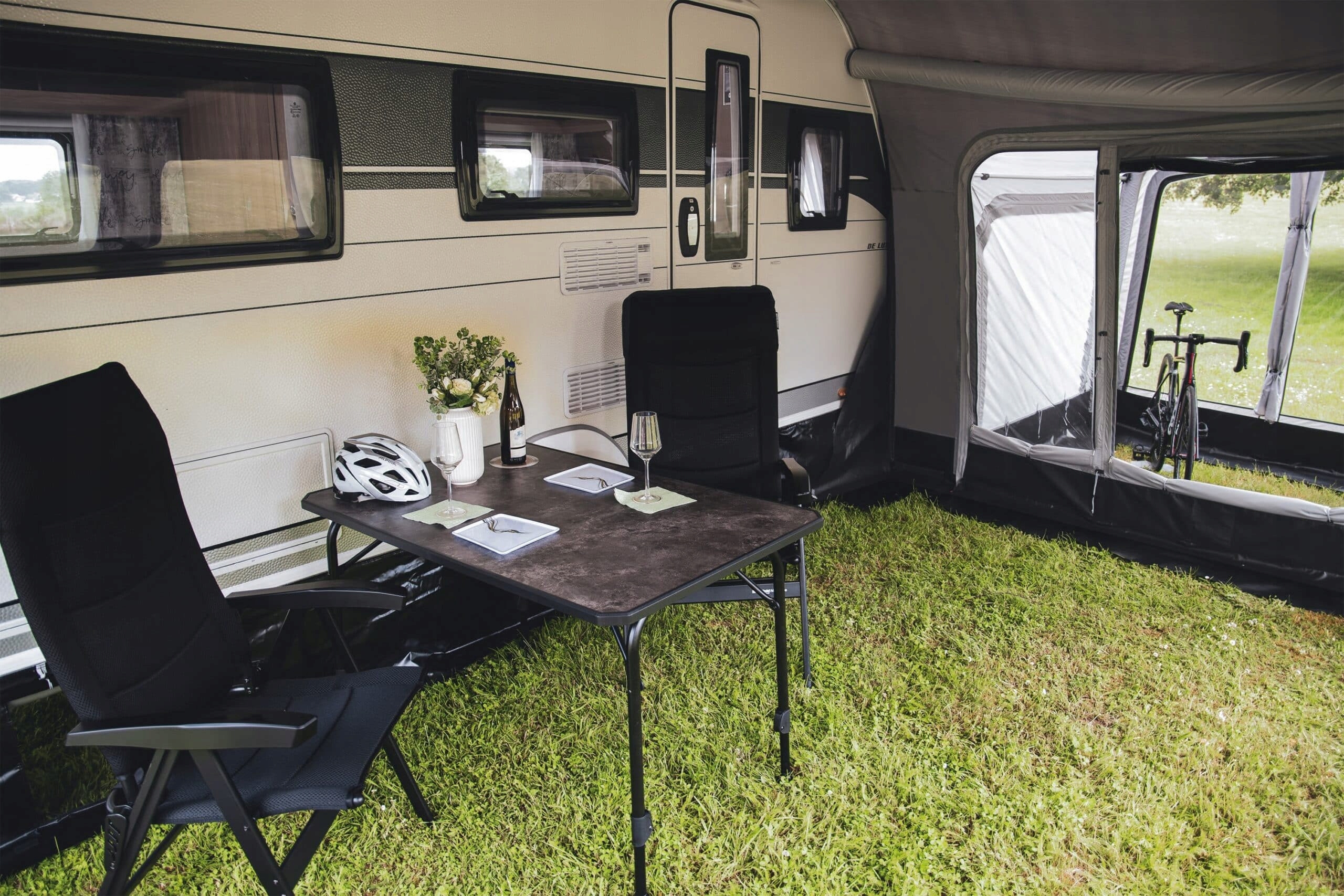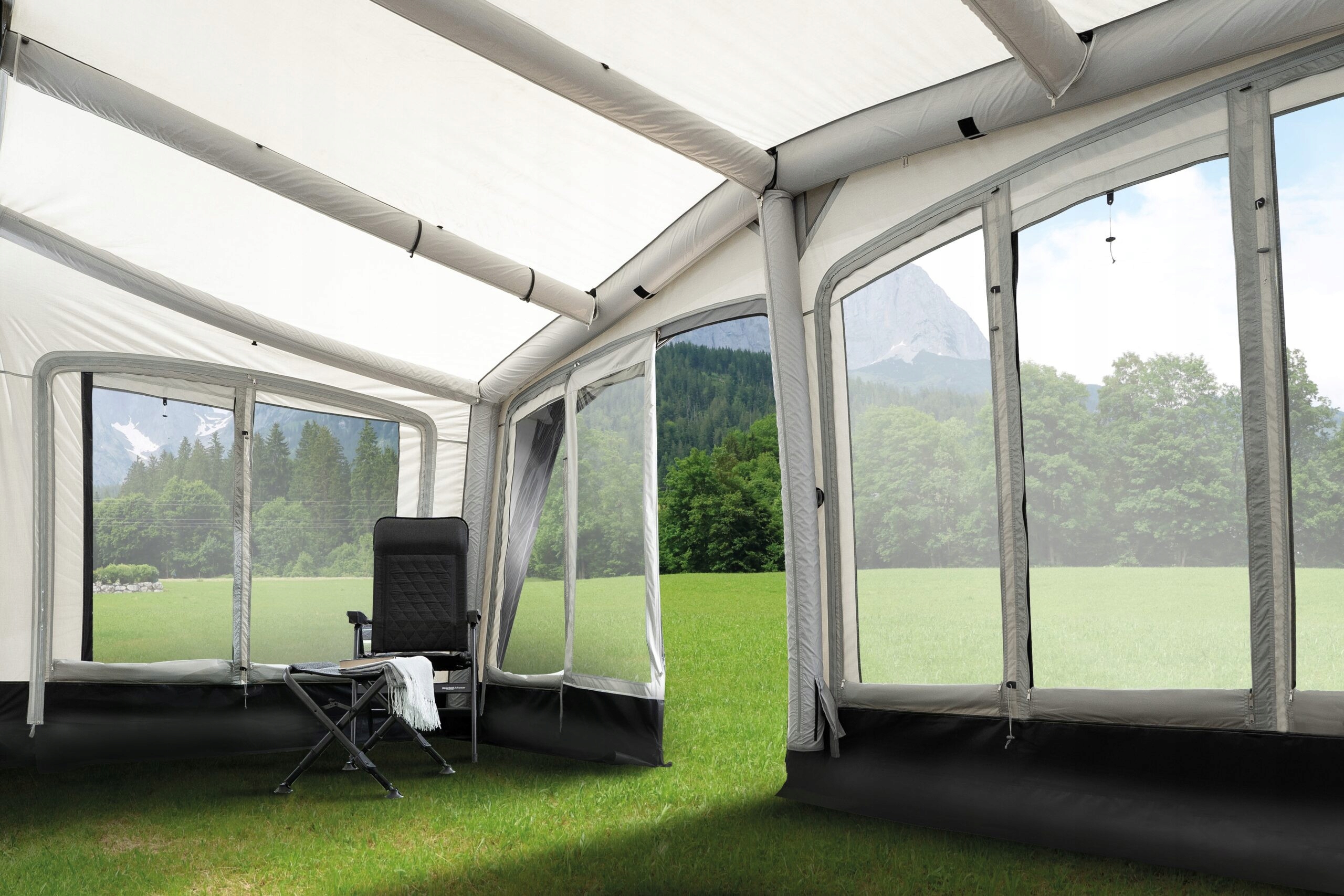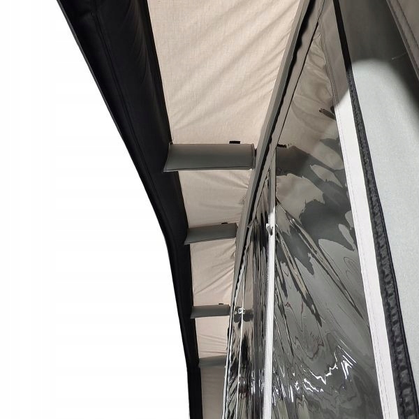 Использованный материал HydroTech® CottonTouch (100% полиэстер) в сочетании с постоянной вентиляцией и тонировкой стекол обеспечивает приятную температуру внутри тамбура даже в жаркие летние дни. Передняя стенка и боковые стенки съемные и оснащены москитными сетками, что позволяет гибко подстраивать конфигурацию тамбура под текущие условия и потребности пользователя.