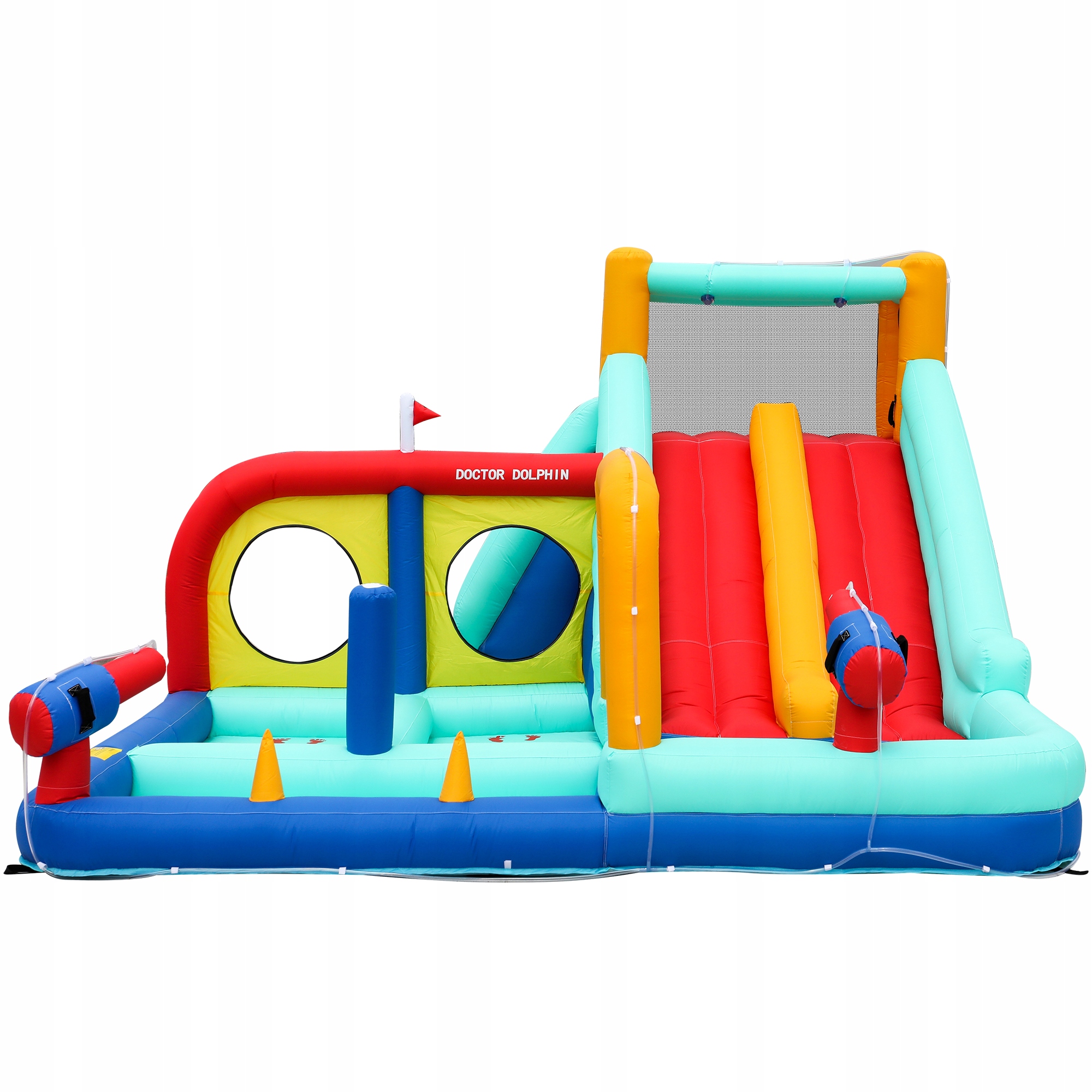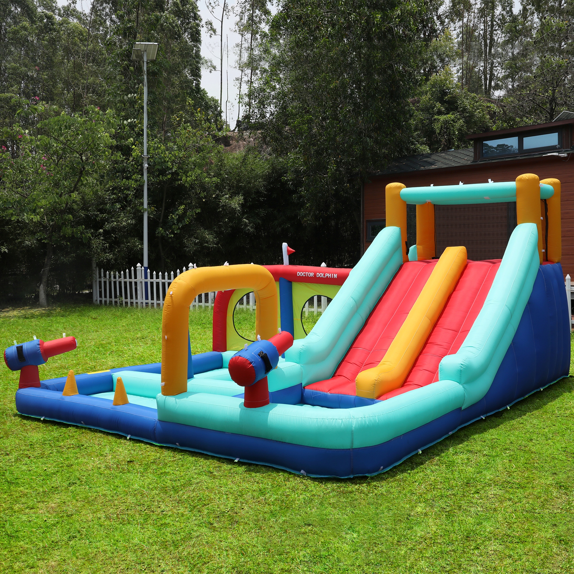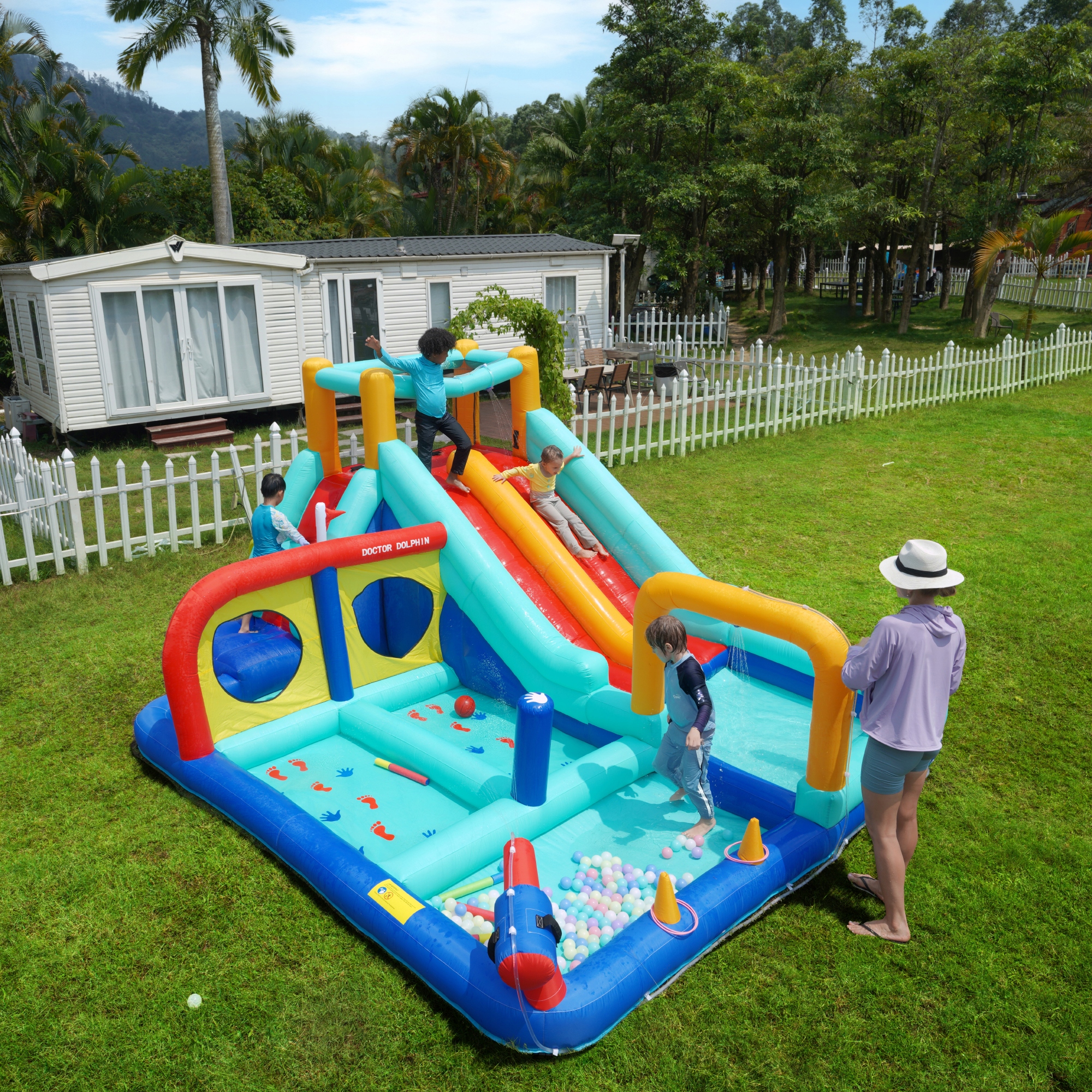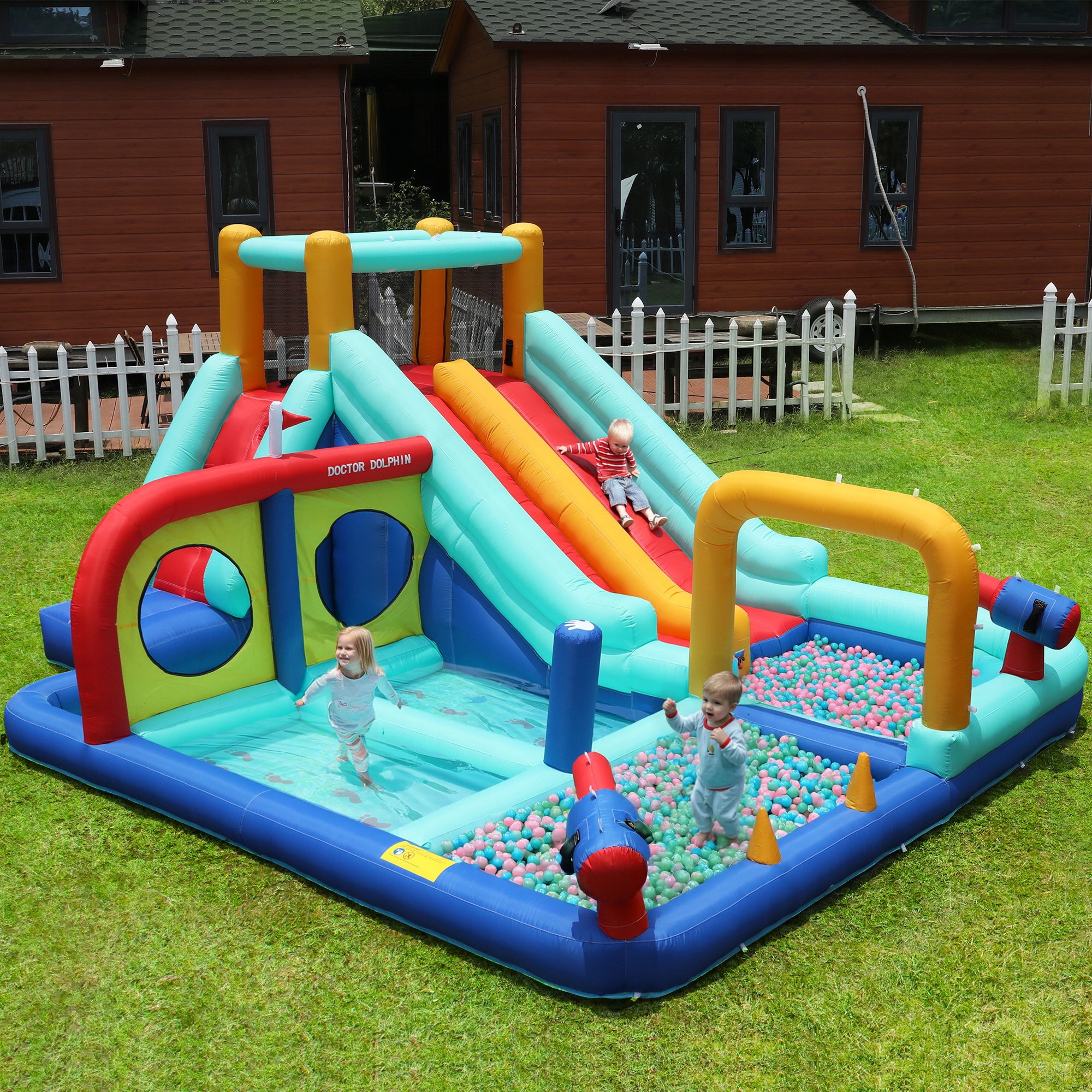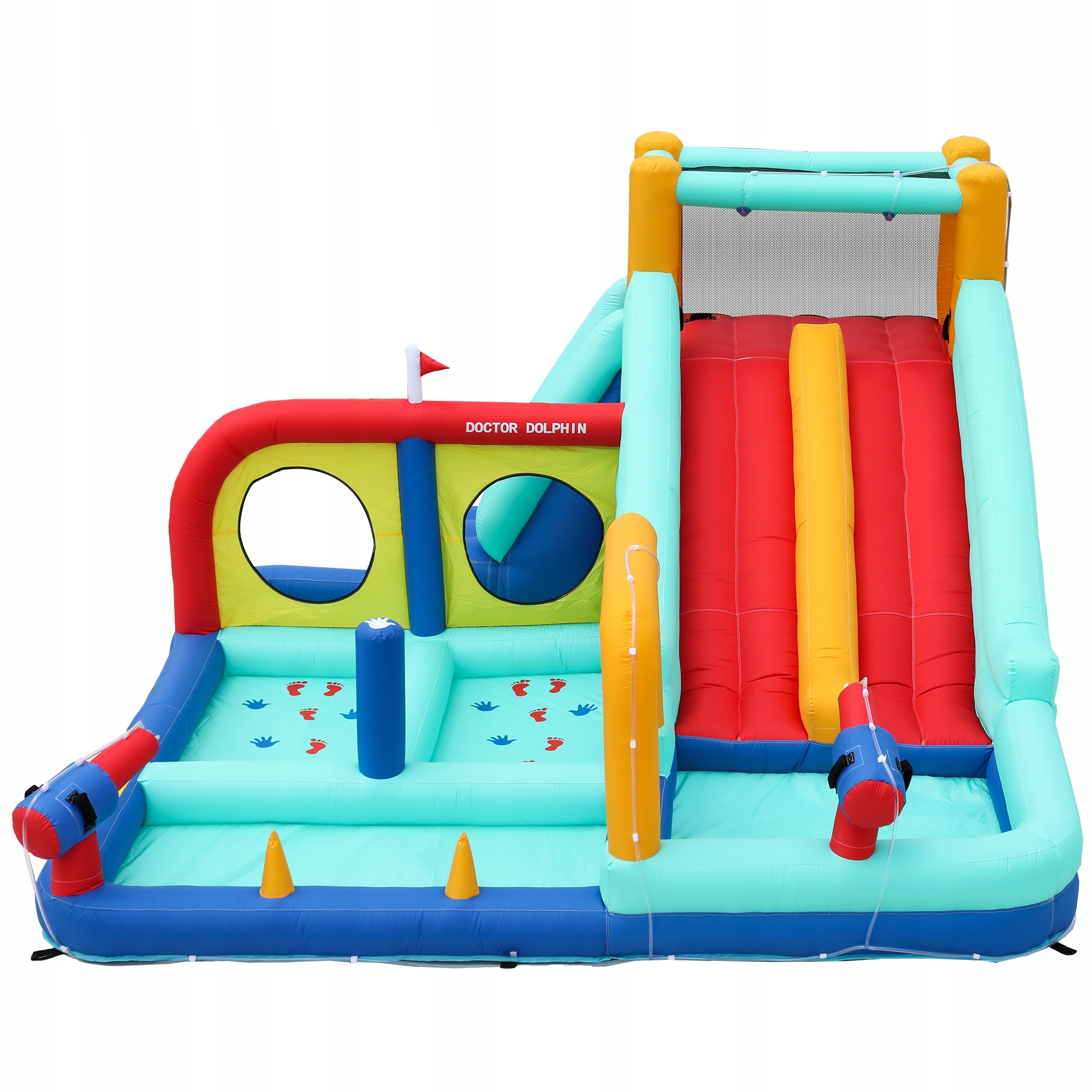 подходит для сухого и влажного использования - идеально подходит для каждого года: освежающий аквапарк, наполняя его водой, зимой его можно использовать в качестве обычного надувного замка - весело в течение всего года!