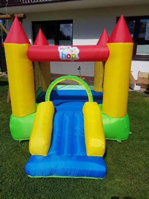 С этим красочным замком в стиле «хиппе-хоп-хоп» каждый оправдает свои деньги. Горка у входа и большая площадка для прыжков гарантируют удовольствие вашим детям. Шесть монтажных анкеров и боковые сетки обеспечивают необходимую безопасность и устойчивость. Все швы молний прошиты двойной строчкой и выполнены из высококачественной ткани Оксфорд (толщина зоны прыжка 840D, толщина боковин 420D).