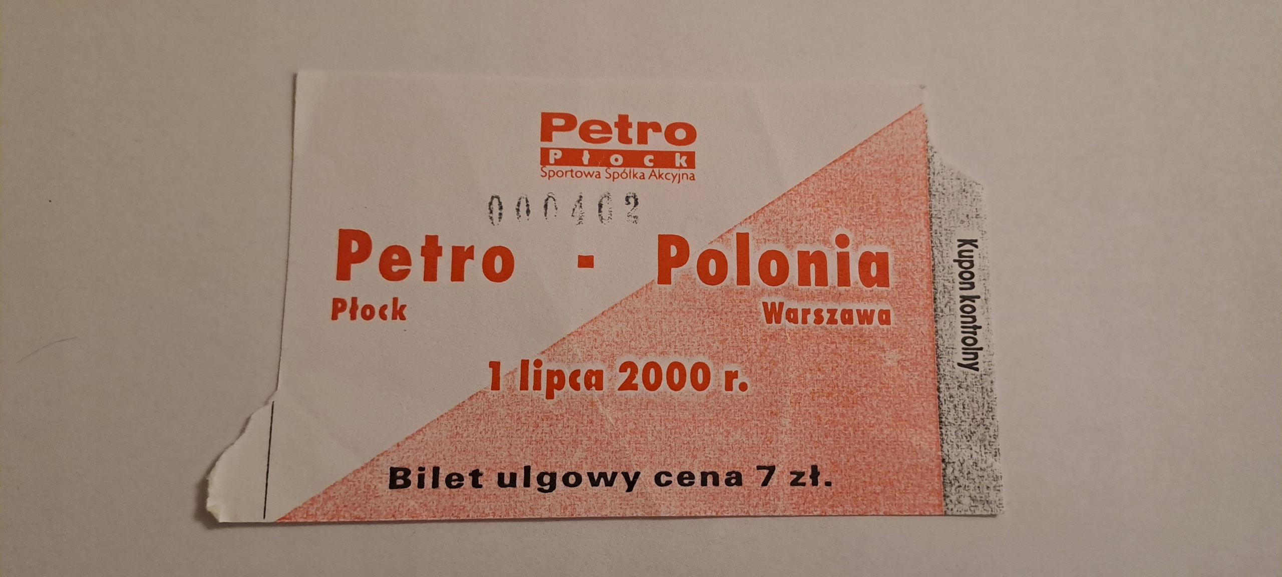 ПЕТРОХЕМИЯ ПЛОЦК - ПОЛЬОНИЯ ВАРШАВА 07.01.2000 БИЛЕТ