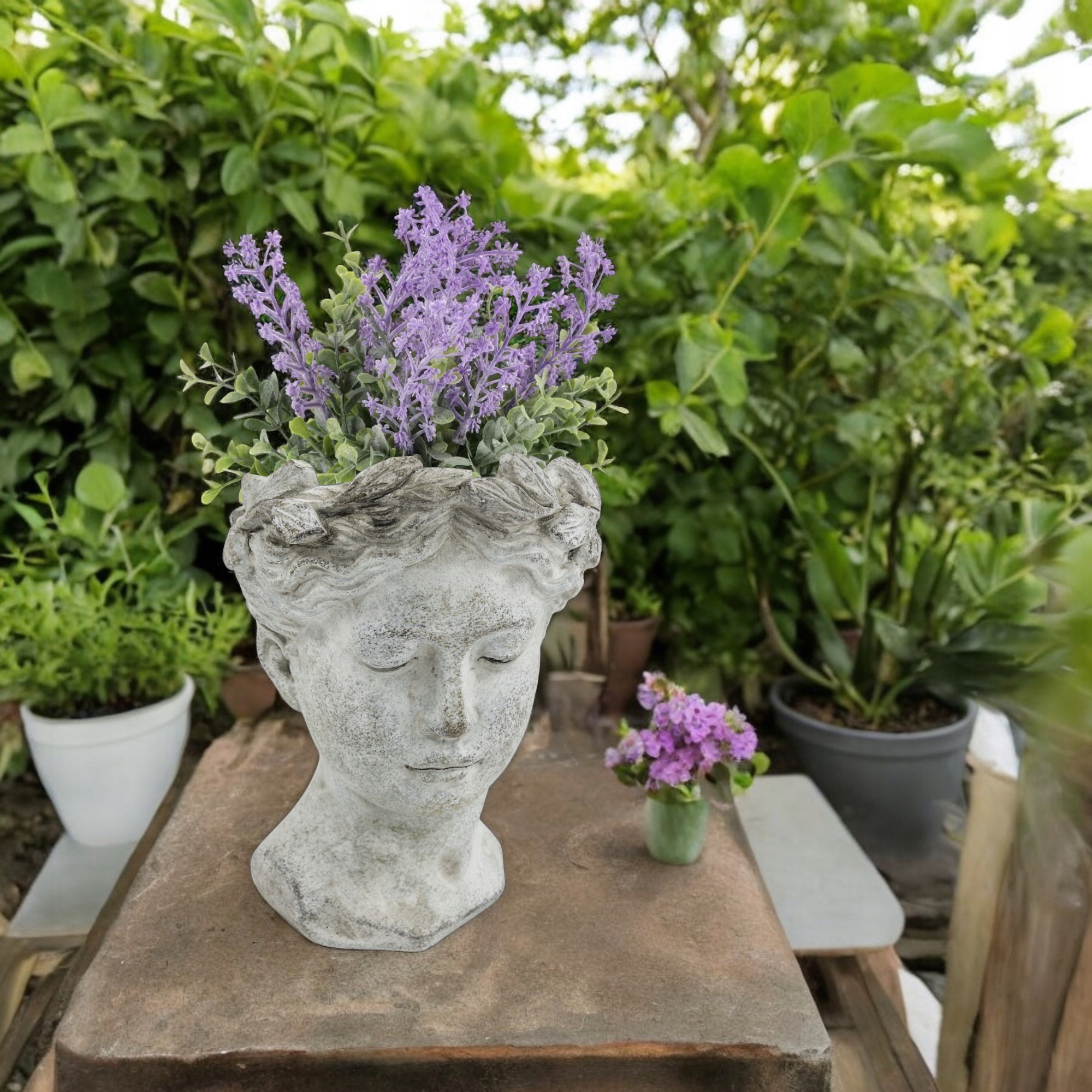 Замечательная и красивая скульптура, изображающая женское лицо. В голове есть специальное место для цветов.