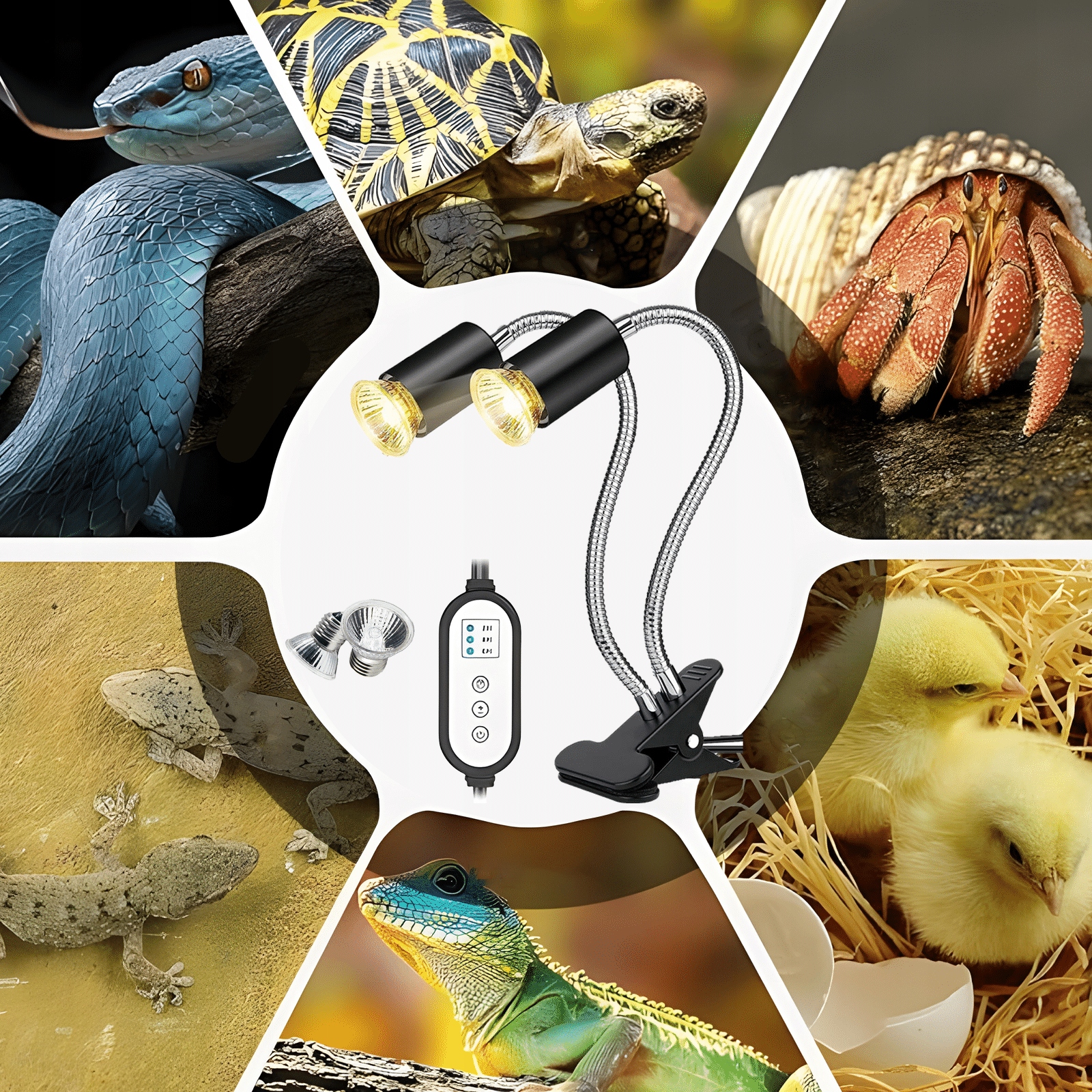 🐢【2 ЛАМПЫ ДЛЯ РЕПТИЛИЙ】Двуглавая лампа для рептилий имеет антиокислительное и взрывозащищенное покрытие. В комплект входит одна точечная лампа мощностью 25 Вт и одна точечная лампа мощностью 50 Вт. Имитирует солнечный свет и обеспечивает необходимое УФ-излучение и температуру для удовлетворения потребностей рептилий в их естественной среде обитания.