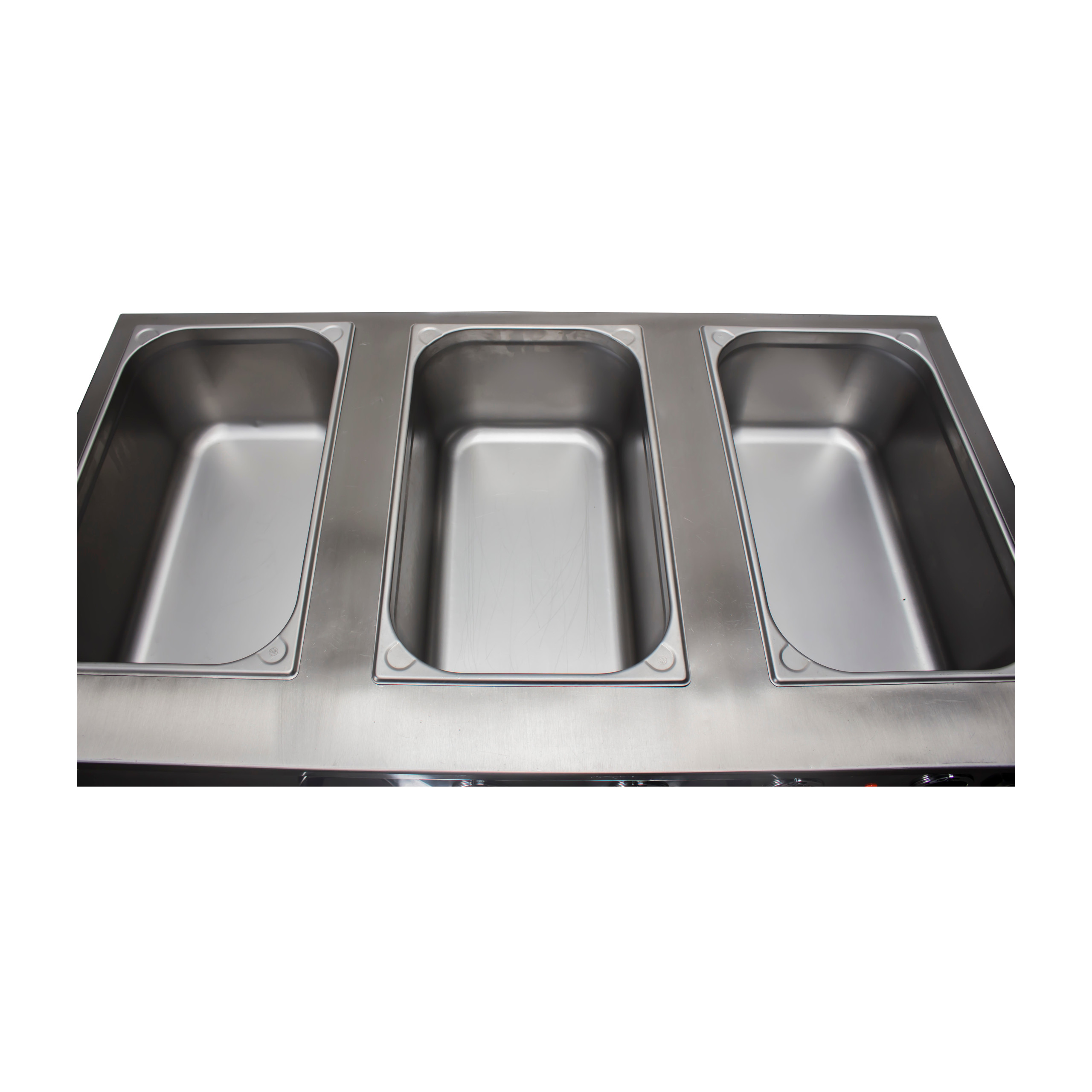 Регулировка температуры обеспечивает гибкие настройки в зависимости от ваших потребностей, а каждая камера управляется отдельно, что позволяет настроить водяную баню в соответствии с вашими потребностями. Баня полностью изготовлена ​​из нержавеющей стали. Устройство имеет 3 камеры, вмещающие 3 контейнера 1/1 GN, и шкаф с подогревом.