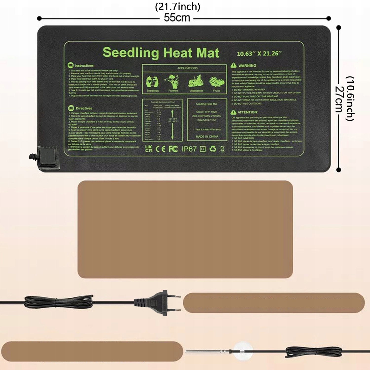 Нагревательный коврик для растений с термостатом, водонепроницаемый нагревательный коврик IP67, нагревательный коврик 27 Вт с функцией таймера, нагревательный коврик для внутренней теплицы для проращивания рассады, рептилий (55x27см)