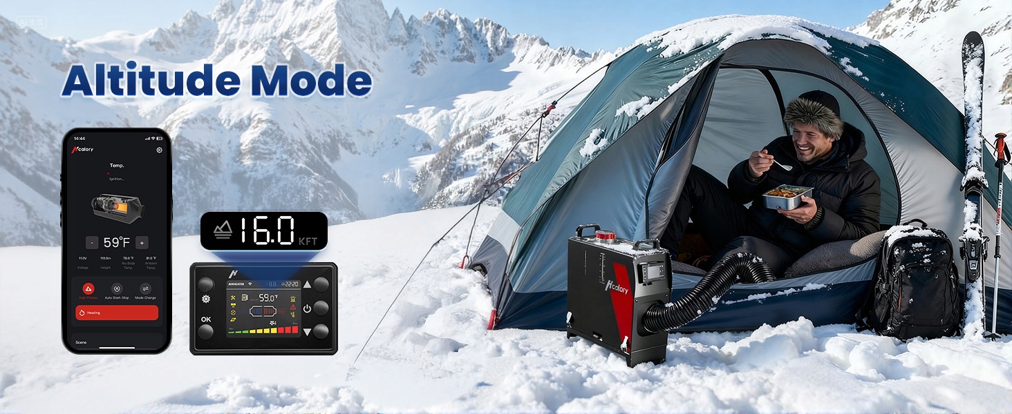 【ИНТЕЛЛЕКТУАЛЬНЫЙ РЕЖИМ ДВОЙНОЙ ВЫСОТЫ】Наш продукт предлагает интеллектуальный режим двойной высоты (2500 м/5000 м), который можно адаптировать для экспедиций по бездорожью и путешествий на большой высоте. Переносной дизельный воздухонагреватель не требует сложной настройки. Интеллектуальная система автоматически определяет и оптимизирует соотношение воздух-топливо, справляясь даже с разреженным воздухом на больших высотах, обеспечивая максимальную эффективность. Даже на высоте 5000 м над уровнем моря вы можете наслаждаться мощным и быстрым обогревом, как если бы вы находились на уровне моря, гарантируя надежный комфорт в каждом путешествии.