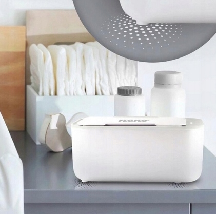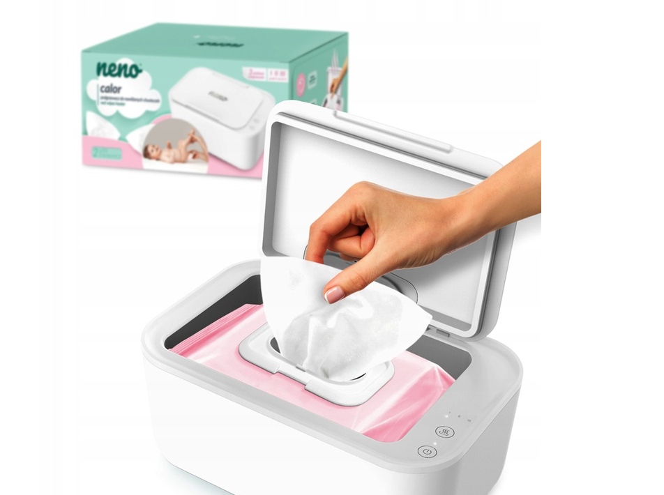 NENO CALOR — электронный подогреватель детских влажных салфеток, работающий на трех уровнях нагрева. Таким образом, вы можете регулировать температуру в зависимости от типа ухода за ребенком. Обогреватель оснащен удобной и приятной сенсорной панелью и нескользящим основанием. Так что вам не придется беспокоиться, что ваш малыш опрокинет контейнер во время ухода. Устройство вмещает до 150 салфеток.
