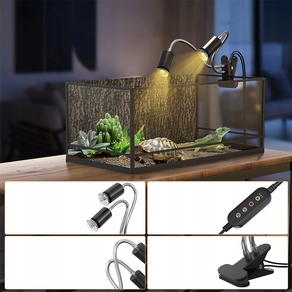 Вы получите две нагревательные лампы для рептилий и двойной держатель лампы с таймером и зажимом.