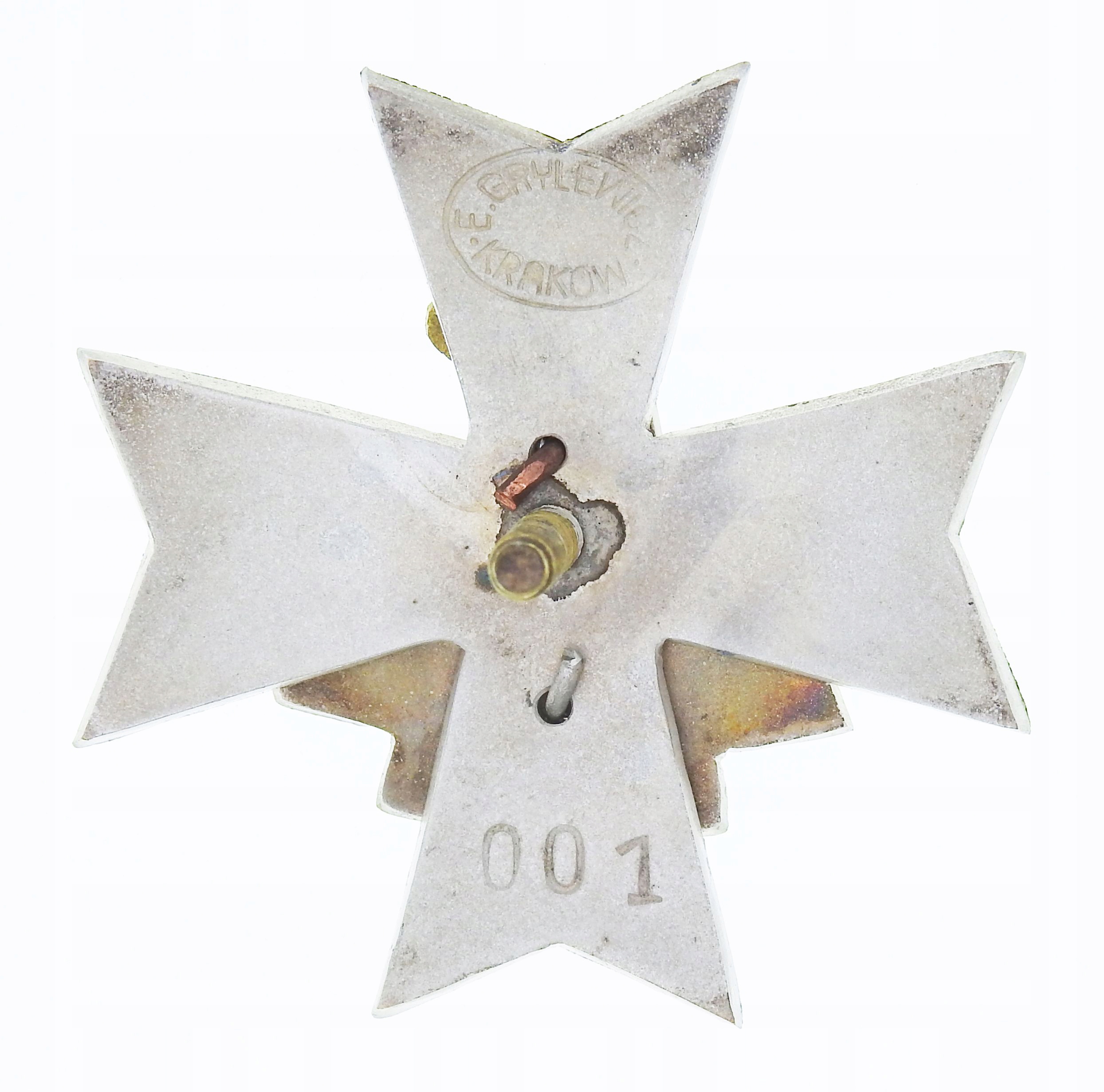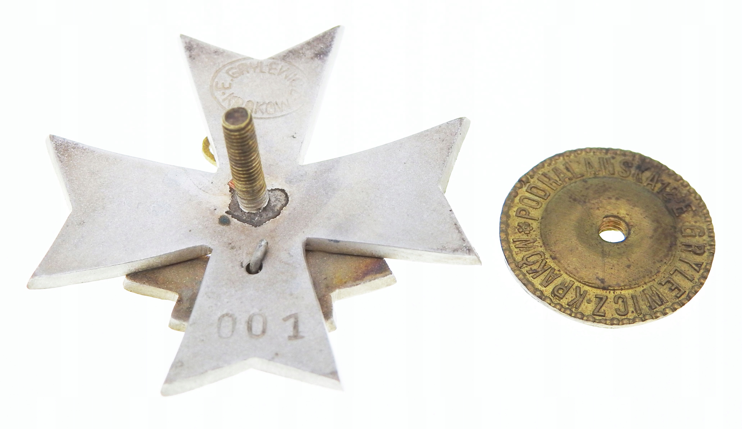 значок, размеры ~40 х 40 мм, 3 части, эмалированный, резьбовое крепление к стойке, гайка диаметром ~21 мм, подпись надписью «Грылевич» Краков", б/у, состояние как на фотографиях, оригинал