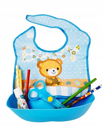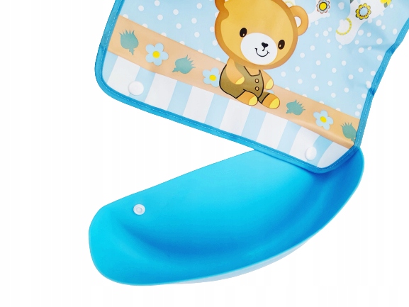 Нагрудник имеет жесткий карман для остатков еды, что облегчает поддержание чистоты во время еды.