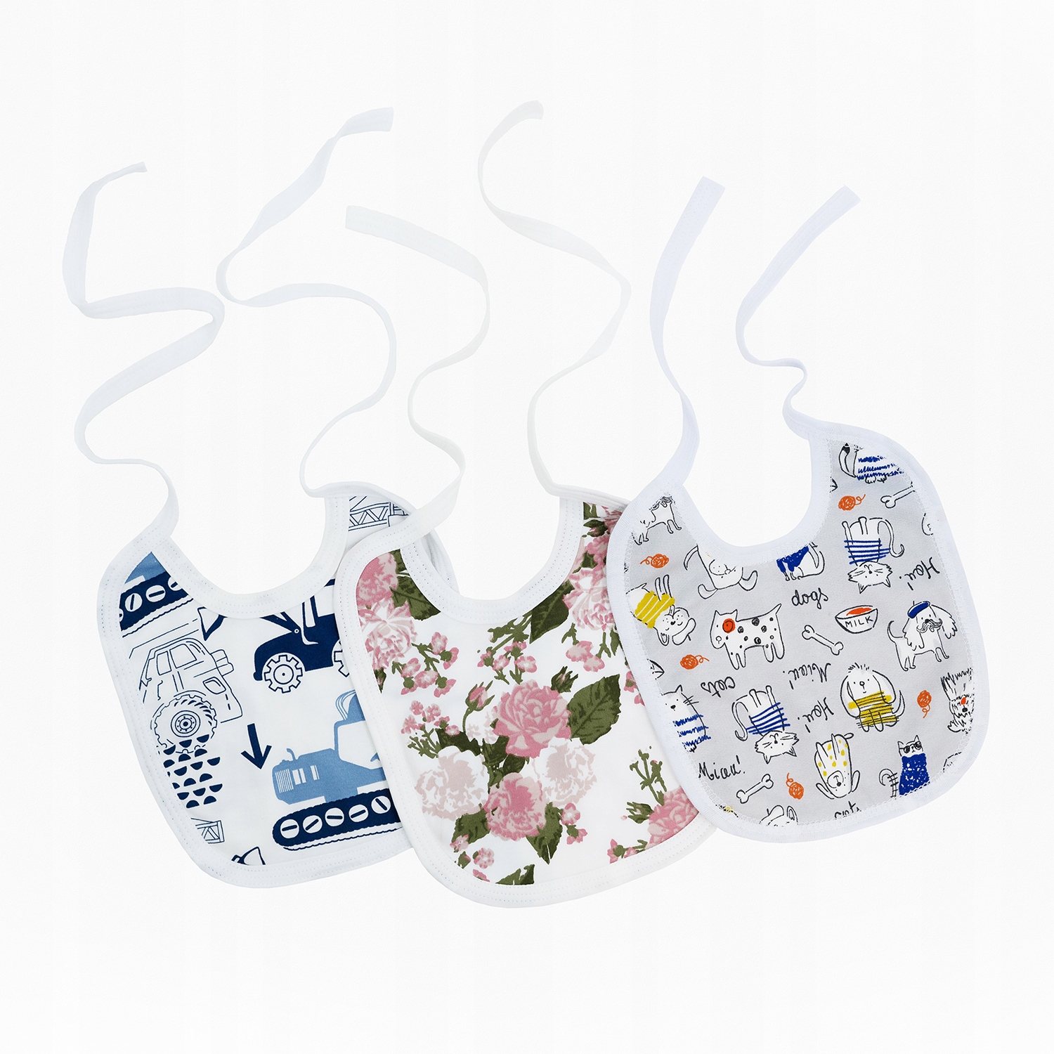 Каждый нагрудник завязывается сзади, что позволяет легко и удобно прилегать к шее ребенка. Это функциональное решение, которое будет хорошо работать как во время кормления, так и во время прорезывания зубов.