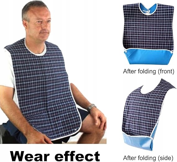 Водонепроницаемый и многоразовый нагрудник для взрослых: Материал: этот нагрудник для взрослых изготовлен из водонепроницаемой ткани, легко чистится. В случае загрязнения промойте или протрите водой. Взрослый нагрудник легче чистится, его можно постирать под краном и повесить сушиться. Взрослые нагрудники для пожилых людей можно стирать неоднократно, что очень удобно для экономии денег и усилий.