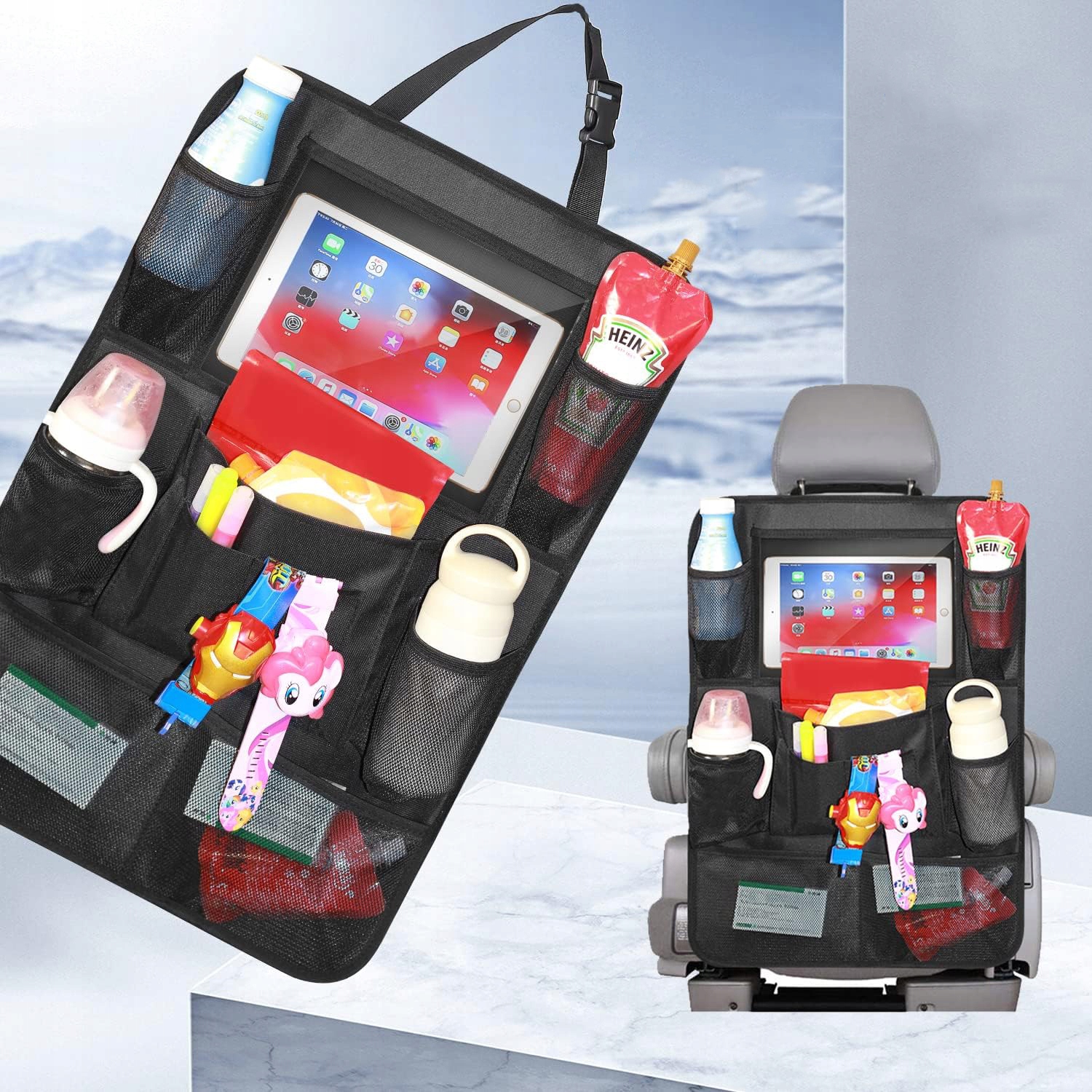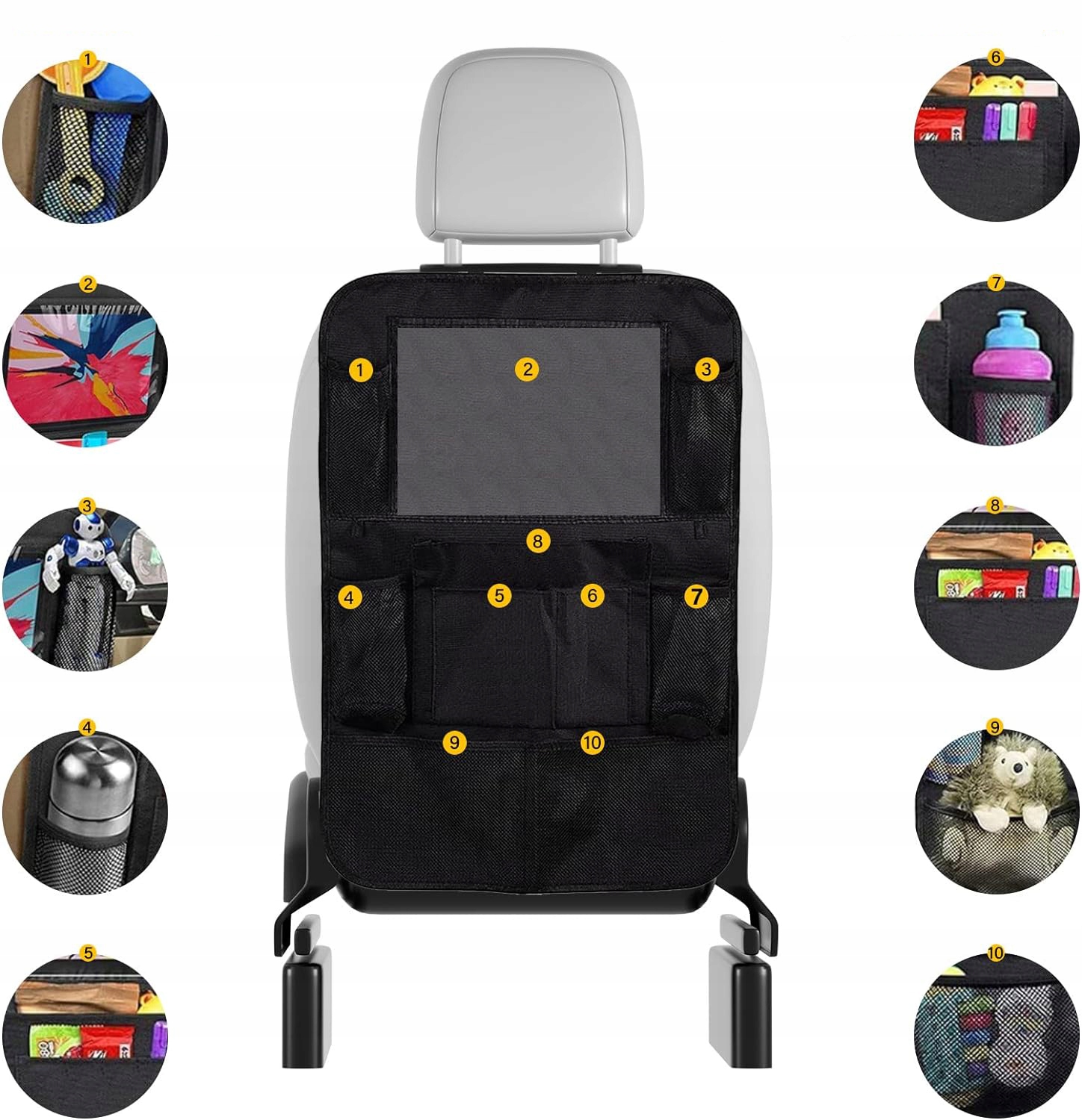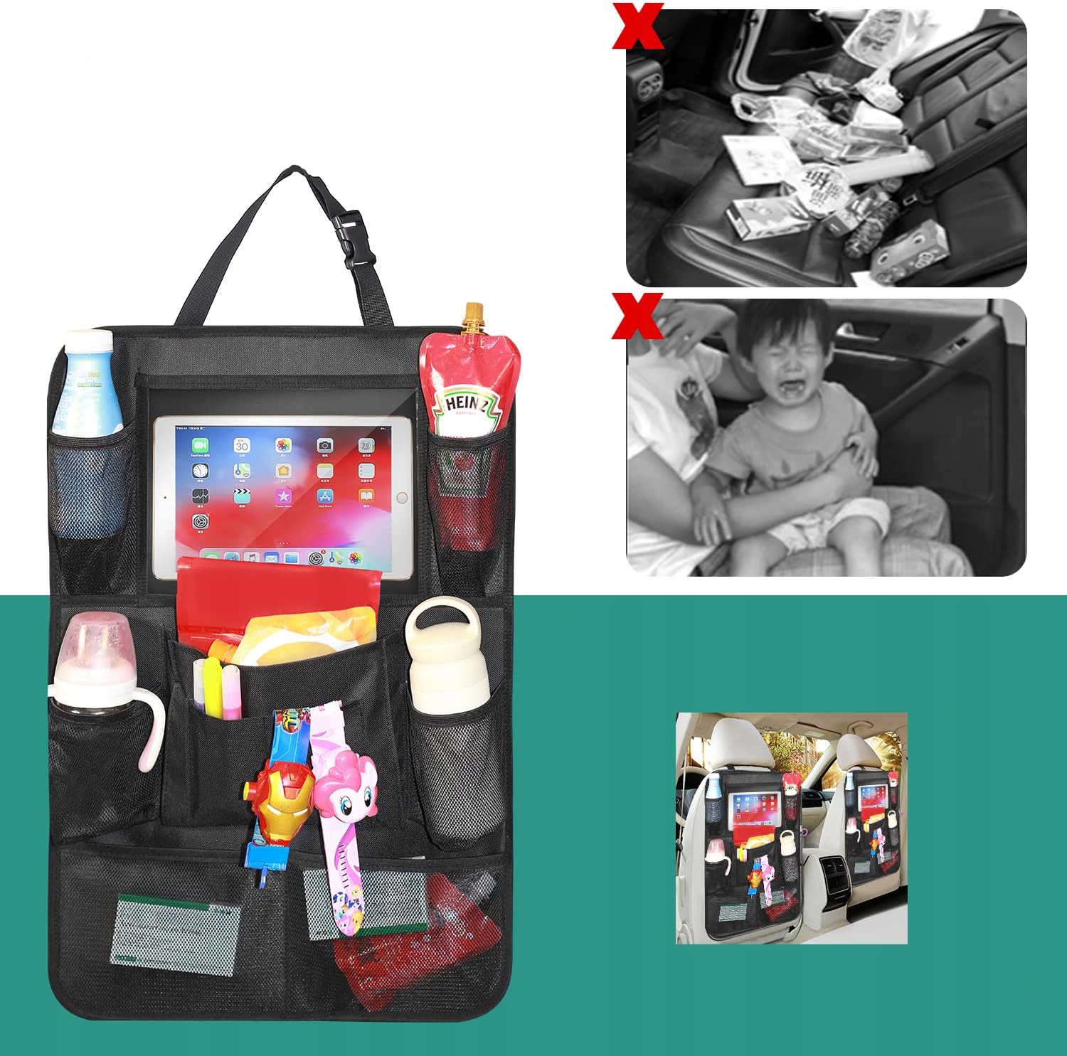 🚗🚗 Высокая емкость: Организатор для заднего сиденья автомобиля с размерами, увеличенными до 62 x 42 см; Поверхность прозрачного окна достигает 27 х 20 см, что означает, что в нем можно легко хранить iPad или планшет. Благодаря этому люди, сидящие на заднем сиденье, могут наслаждаться вождением радости благодаря таблетке; Защитник Backrest имеет 10 отсеков для хранения, которые предоставляют больше места для хранения напитков, игрушек для детей, книг и журналов, что делает путешествие проще и приятнее.