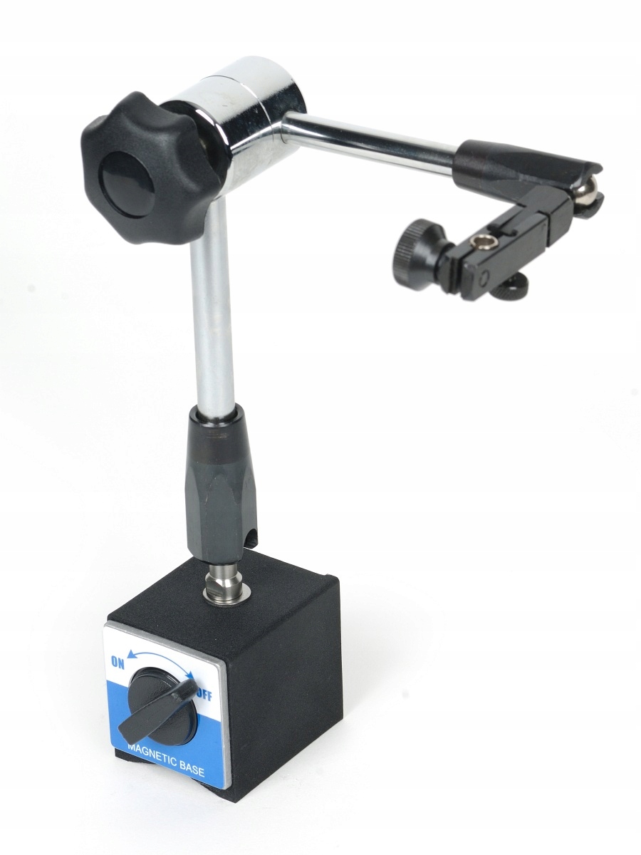 Штатив имеет фиксатор, обычно называемый гидравлическим, все рычаги штатива поворачиваются одной ручкой, крепление штатива магнитное с усилием 784 Н - 80 кг. размеры основания: 55 x 50 x 63 мм.