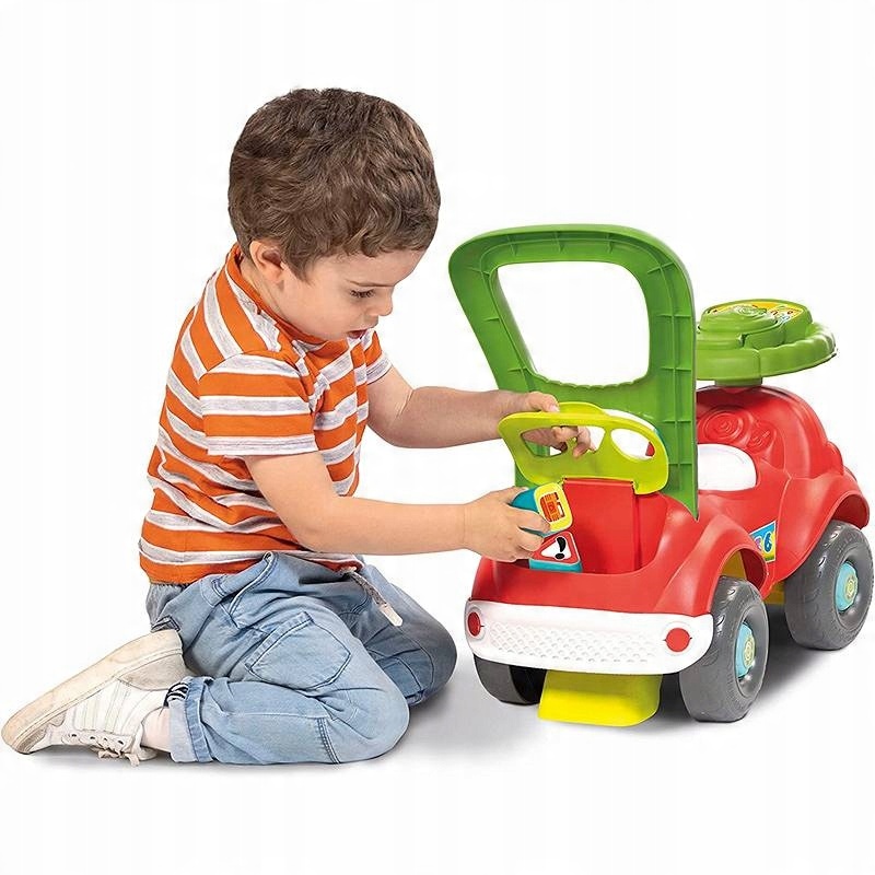Игрушка также оснащена элементами, стимулирующими ловкость рук и воображение, такими как рожок, открывающийся капот с шестеренками и отверстиями для вставки фигур, которые можно найти в открывающемся багажнике.