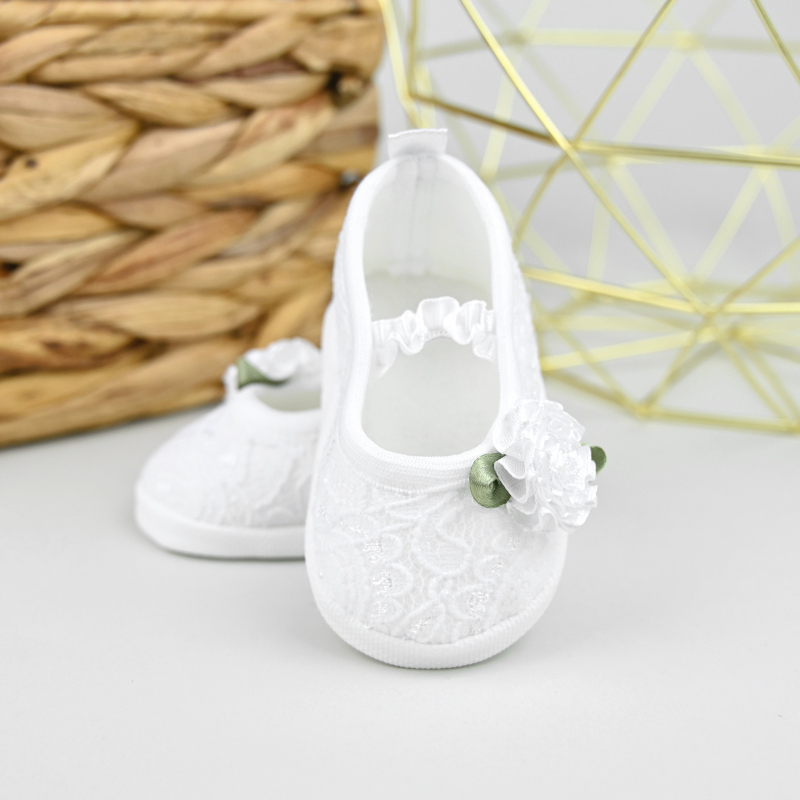 Белые балетки с расшитым кружевом, идеальны для крещения.