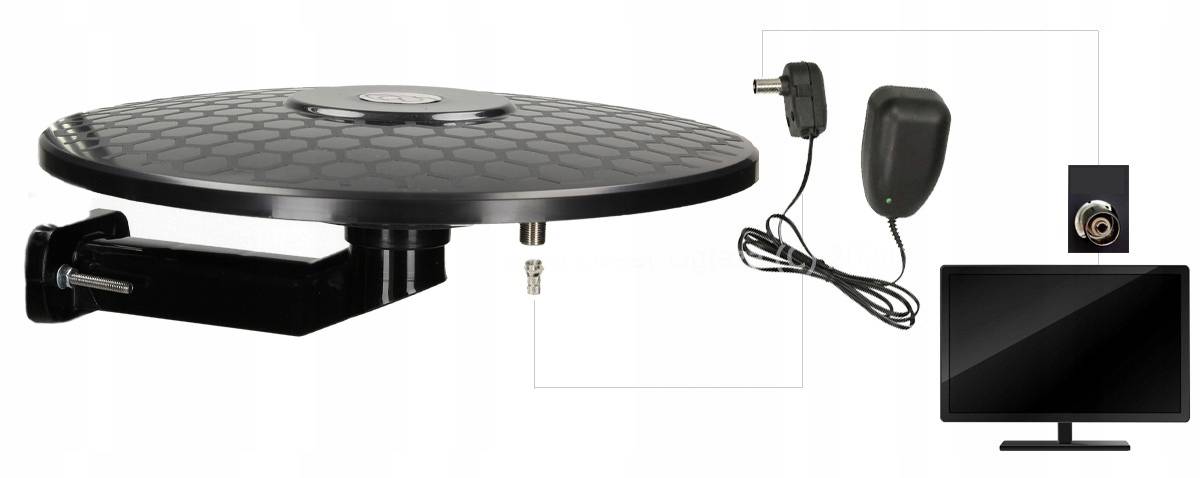 Антенна DVB-T поставляется с наконечником F-типа, готовым для установки на коаксиальный кабель, например RG-6 (не входит в комплект). Антенна оснащена источником питания переменного тока напряжением 230 В, что обеспечивает правильную работу встроенного в антенну усилителя. Коаксиальный кабель должен быть правильно установлен внутри вилки питания антенны. Затем подключите блок питания к блоку питания и подключите вилку к разъему RF-IN (Antenna IN) на телевизоре. Если ваш телевизор не имеет встроенного тюнера для приема цифрового эфирного телевидения DVB-T/DVB-T, подключите антенну к внешнему тюнеру DVB-T/DVB-T2 аналогичным образом. Входящий в комплект адаптер переменного тока подходит для использования в помещении.