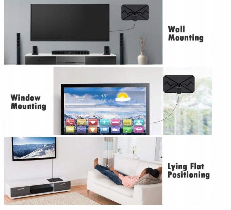Цифровая антенна HDTV с коаксиальным кабелем 16,5 фута, усилитель сигнала, запасная наклейка, простая и удобная в использовании. Установка, благодаря которой она может быть размещена практически в любом месте без необходимости использовать источник питания.