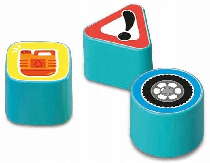 Игрушка также оснащена элементами, стимулирующими ловкость рук и воображение, такими как рожок, открывающийся капот с шестеренками и отверстиями для вставки фигур, которые можно найти в открывающемся багажнике.