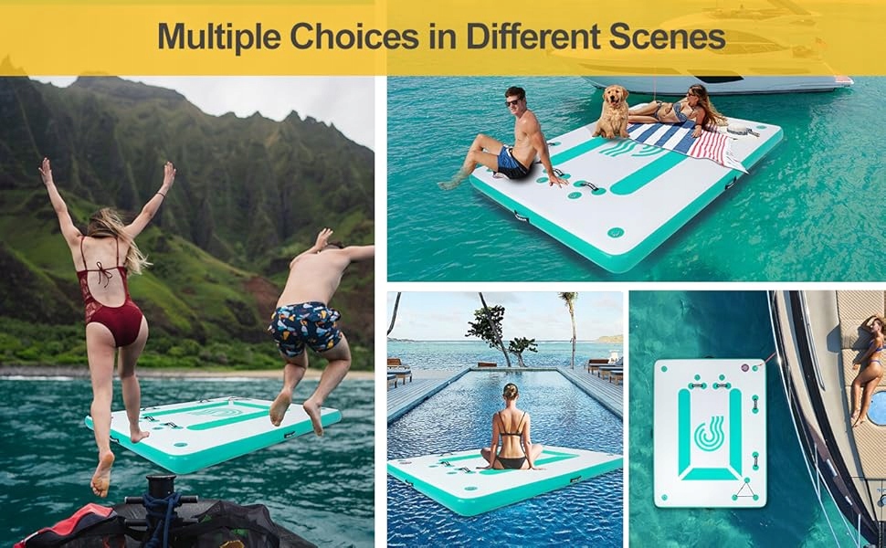 ⭐ размер- надувная дока имеет 8x6 футов, толщиной 6 дюймов. Он может разместить 4-5 человек и весил около 500 фунтов. Вы можете положить на него сиденья и холодильник. Отлично подходит для плавания, солнечной ванны, йоги, рыбалки или плавания.