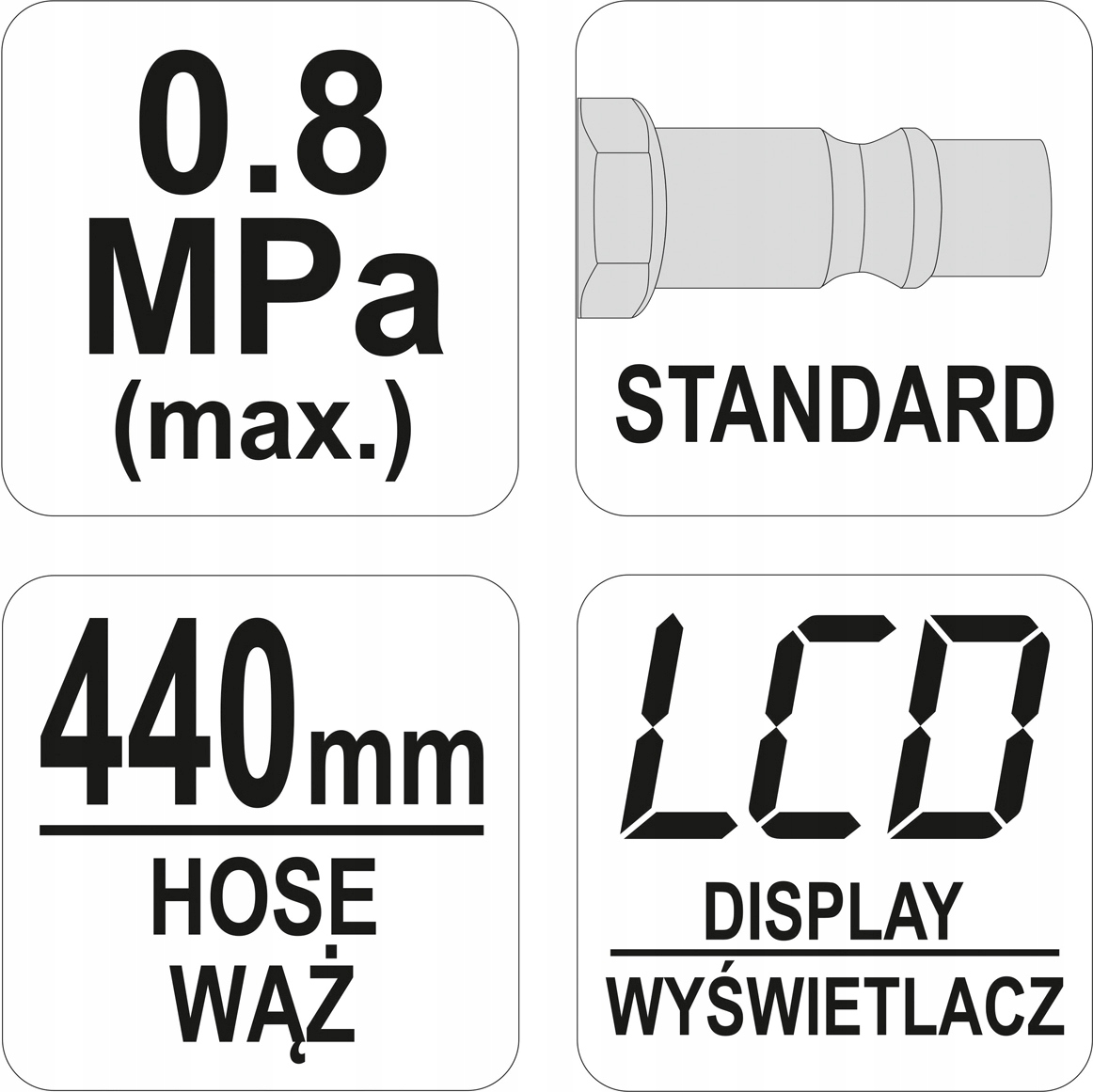 Пистолет Yato YT-23702 оснащен калибром давления с помощью электронного ЖК-дисплея и автоматическим переключателем, с максимальным давлением до 8 бар , что позволяет управление давлением воздуха в накачарованном продукте и поддерживает четыре типа: PSI, MPA, MPA, MPA/B/B/B.
