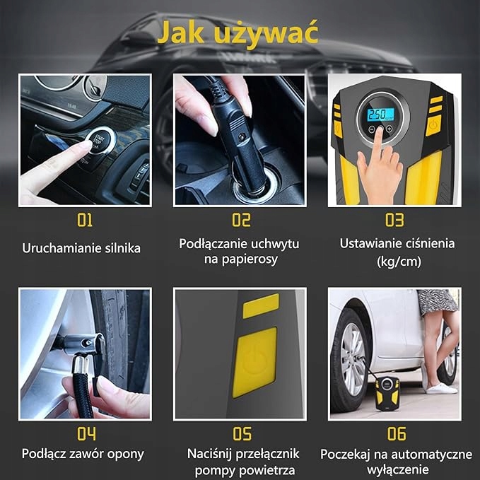 ⋆ Быстро и просто: Так же просто, как подключиться к розетке 12 В вашего автомобиля, прикрепить штифт к вентилю шины, одно простое нажатие, и наш портативный насос для шин имеет достаточную мощность, чтобы накачать стандартную автомобильную шину за 3-5 минут.