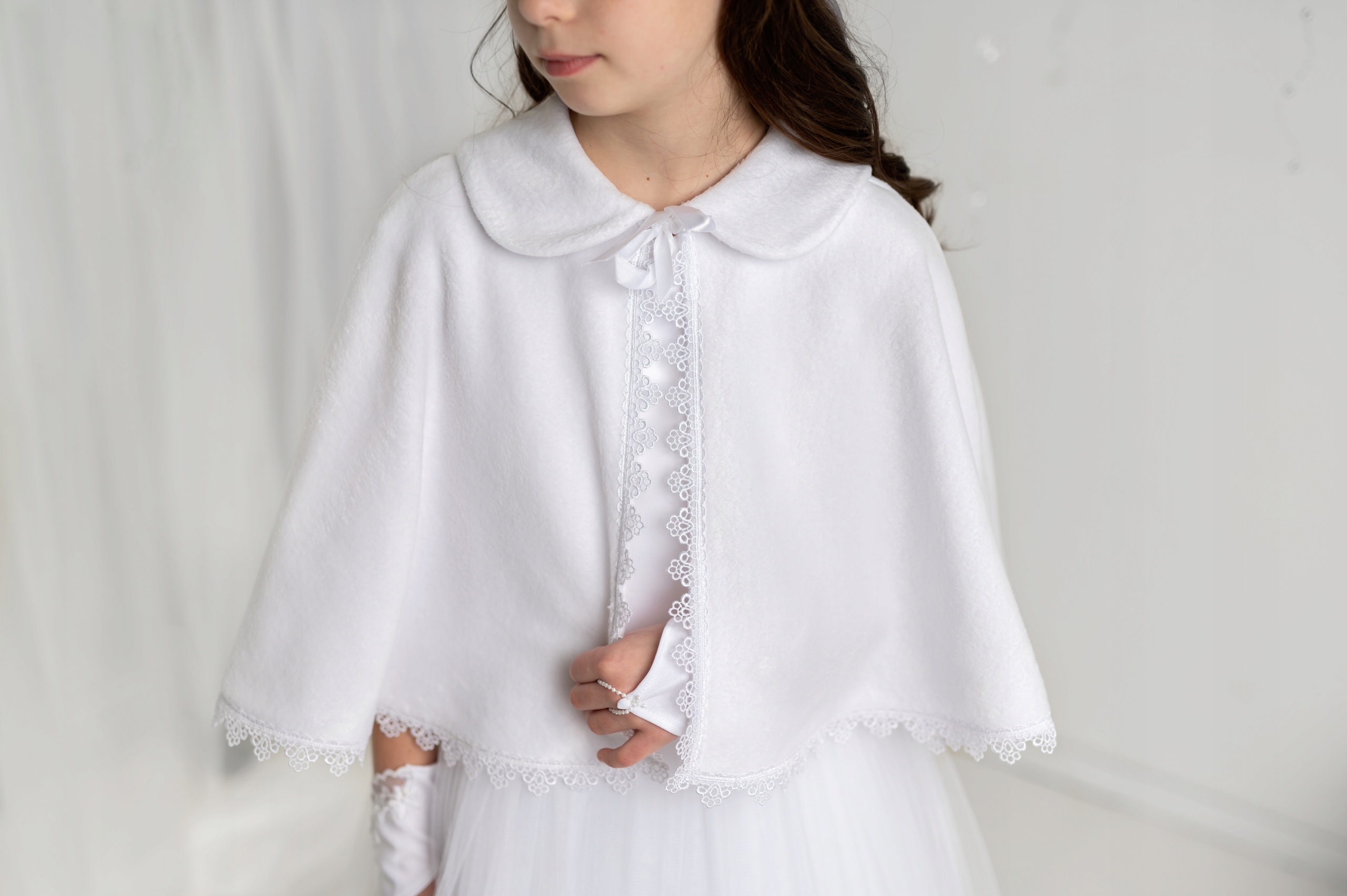 Красивый снежный плащ, изготовленный из высококачественного флиса. Под шеей воротник связан с атласными лентами, все обрезано декоративным кружевом. Он подходит как платье, так и Альбе. Идеально подходит для более прохладного дня первого святого причастия