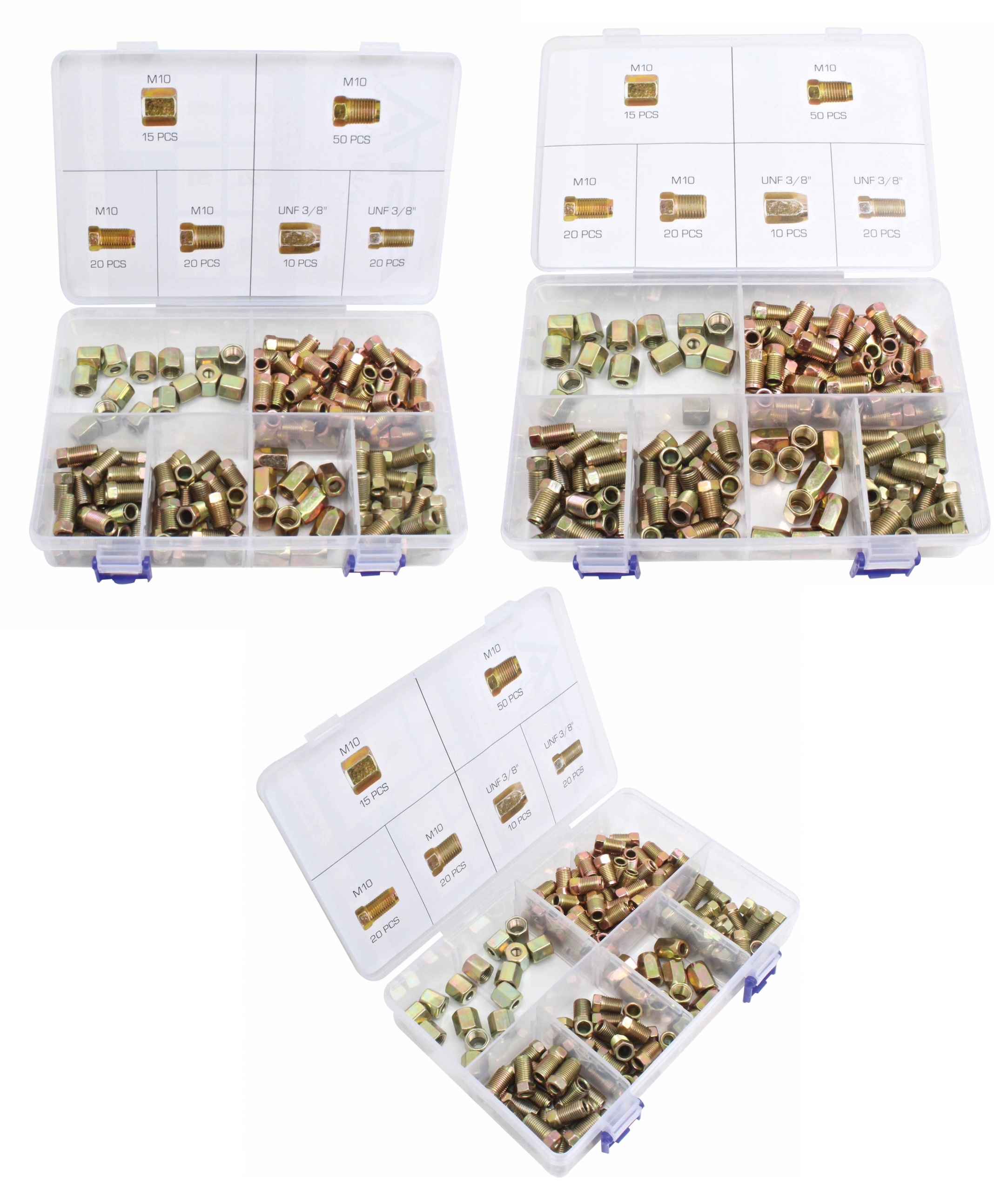 Набор соединительных гаек и болтов наиболее популярных метрических и дюймовых размеров, предназначенных для соединения тормозных магистралей диаметром 3/16 дюйма (4,75 мм).