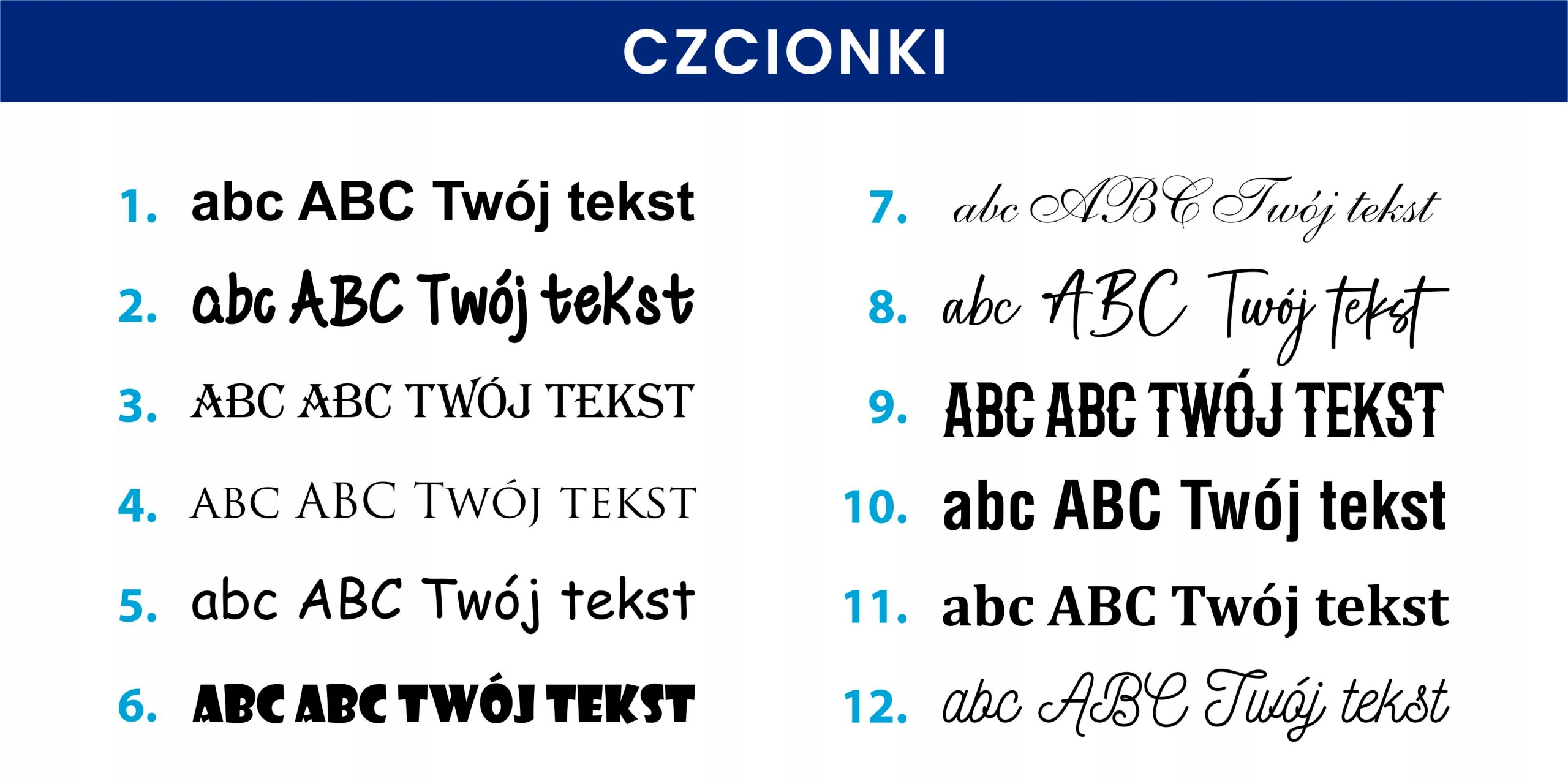 На основании отправленной информации мы оформляем заказ. Если вы заинтересованы в получении визуализации вашей надписи всеми шрифтами - мы можем подготовить ее для вас за дополнительную плату - 15 злотых.