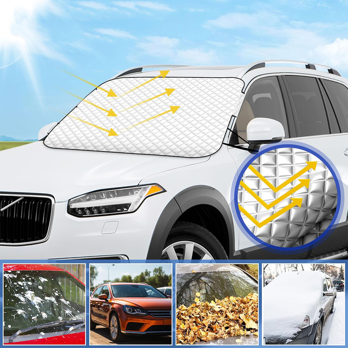 💎ЛЕТО И ОСЕНЬ: Солнцезащитный козырек лобового стекла блокирует 99% ультрафиолетового излучения жарким летом, сохраняет прохладу в салоне автомобиля, предотвращает старение компонентов внутреннего оборудования и защищает зону дворников от попадания веток или падения листья.