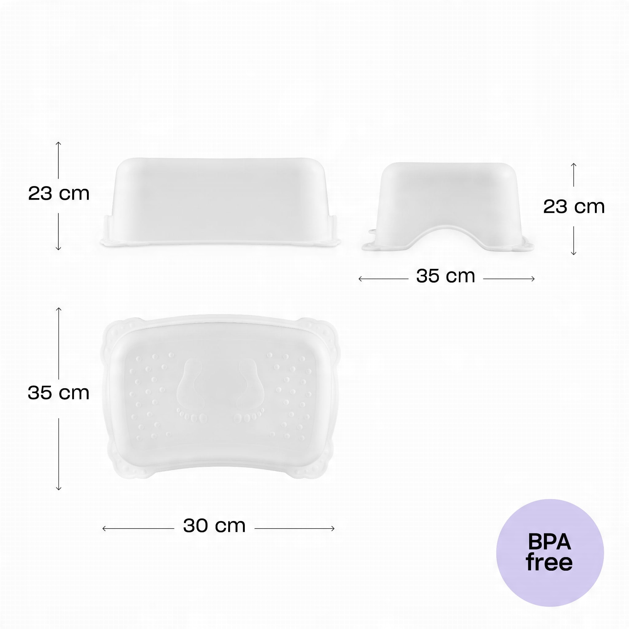 РАЗМЕРЫ - Детское сиденье для унитаза изготовлено из эластомера и полипропилена (без BPA и пластификаторов). Размеры: длина/ширина/высота 39 см / 30 см / 13,5 см