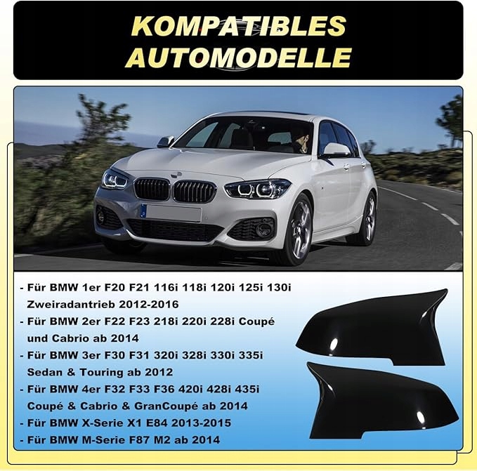 Запасные чехлы для зеркал заднего вида для крышки бокового зеркала, совместимые с BMW F20 F21 F22 F23 F30 F31 F32 F33 F36 X1 E84 i3 M2 F87, глянцевый черный