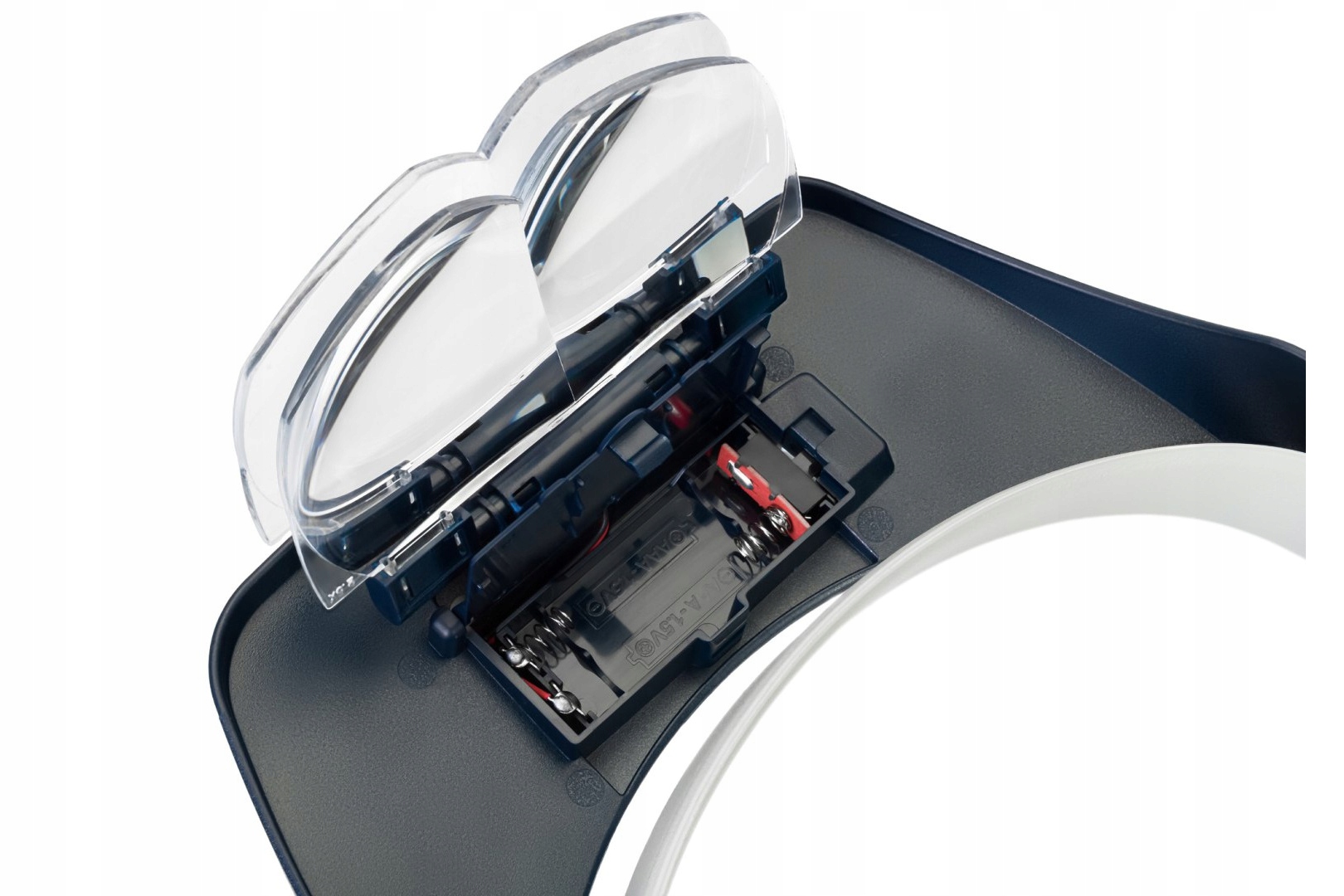 Посередине расположена осветительная панель с двумя яркими светодиодами. Освещение питается от стандартных батареек. Размер оголовья лупы регулируется.