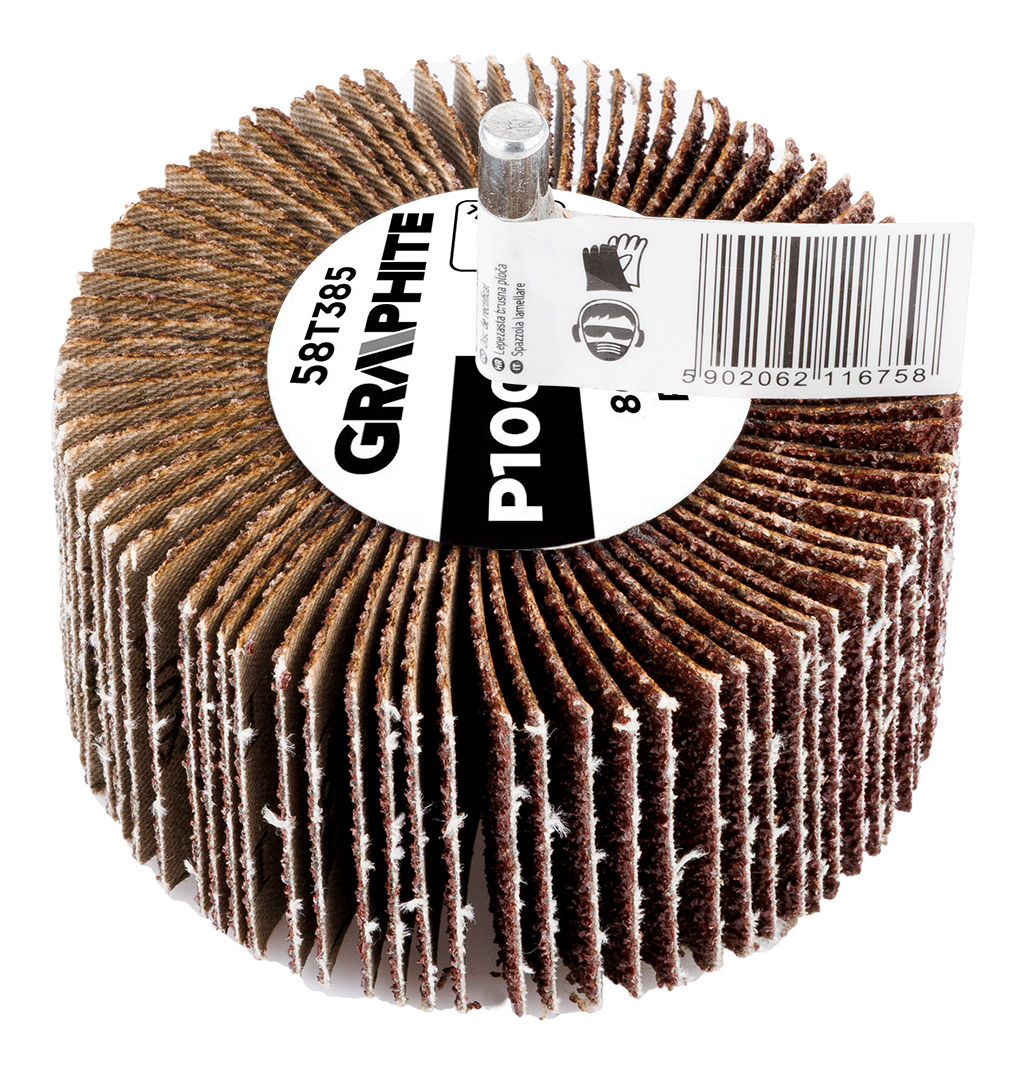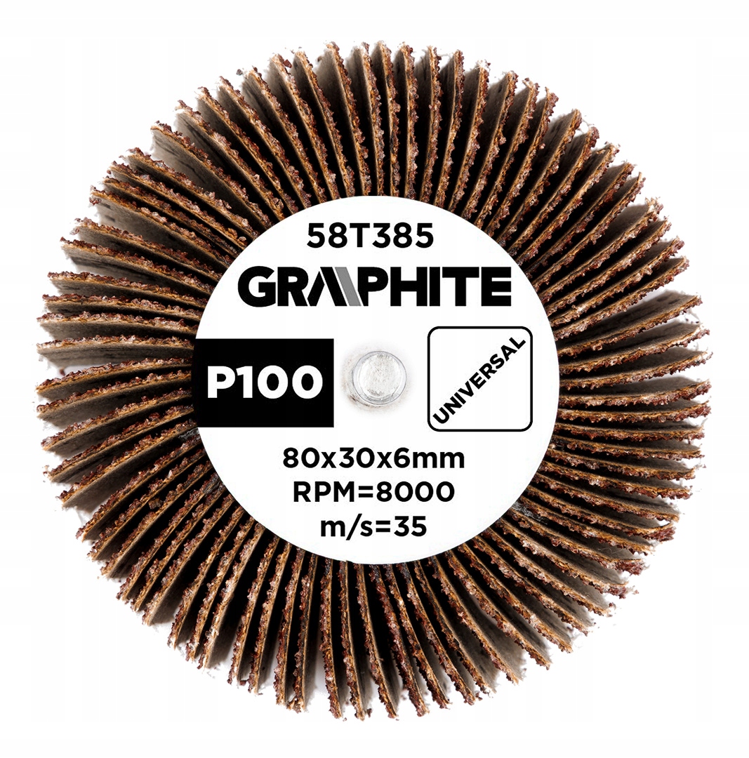 Лепесточный круг ГРАФИТ насадной 80 х 30 х 6 мм, Р100, 58Т385 имеет размеры 80×30×6 мм и зернистость Р100. Предназначен для универсального использования, особенно при обработке труднодоступных мест. Зерно изготовлено из электрокорунда, связка – синтетическая смола. Максимальная рекомендуемая скорость вращения для этого шлифовального круга марки GRAPHITE составляет 8000 об/мин, а рабочая скорость - 35 м/с.