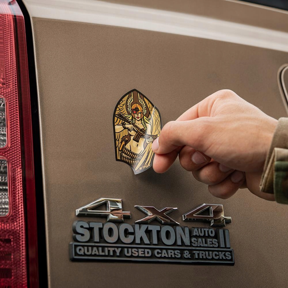 На наклейке изображена модернизированная и решительная Валькирия в стилизованном нормандском шлеме и с автоматом М4 в руках. Наклейка, выполненная в виде знаменитой американо-канадской нашивки Arrowhead, которая является визитной карточкой легендарного военного формирования спецназа США (First Special Service Force), созданного во время Второй мировой войны.