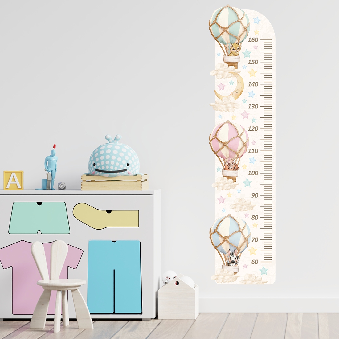 Наклейка на стіну з діаграмою зросту, повітряні кульки з тваринами в пастельних тонах