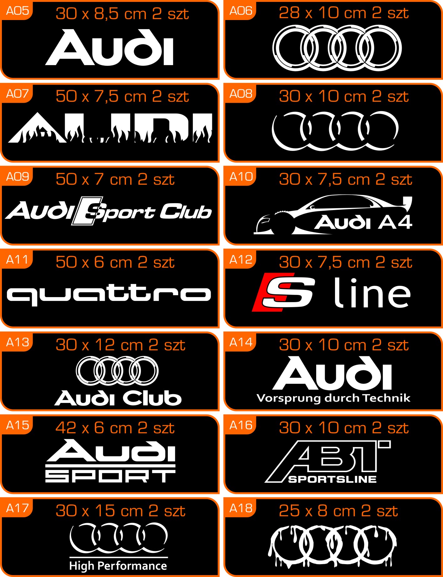 Предмет аукциона - набор наклеек (это реплики) на выбор из представленных ниже дизайнов, например ABT , Audi Sport Club, Quattro, Allroad и т. д. в любом цвете. Размеры наклеек подобраны таким образом, чтобы они поместились на дверях вашего автомобиля.