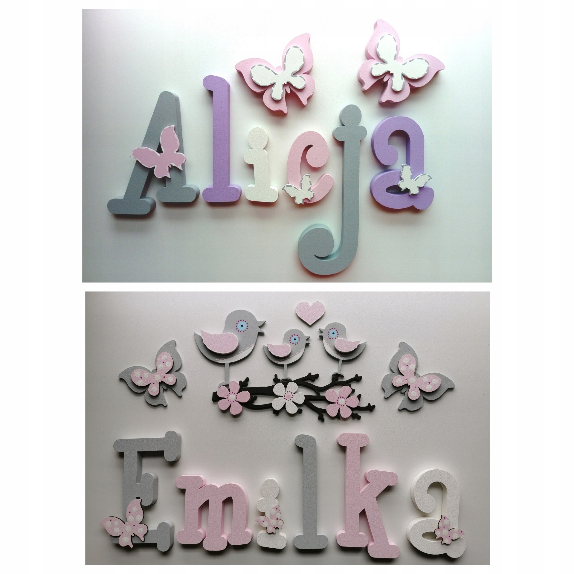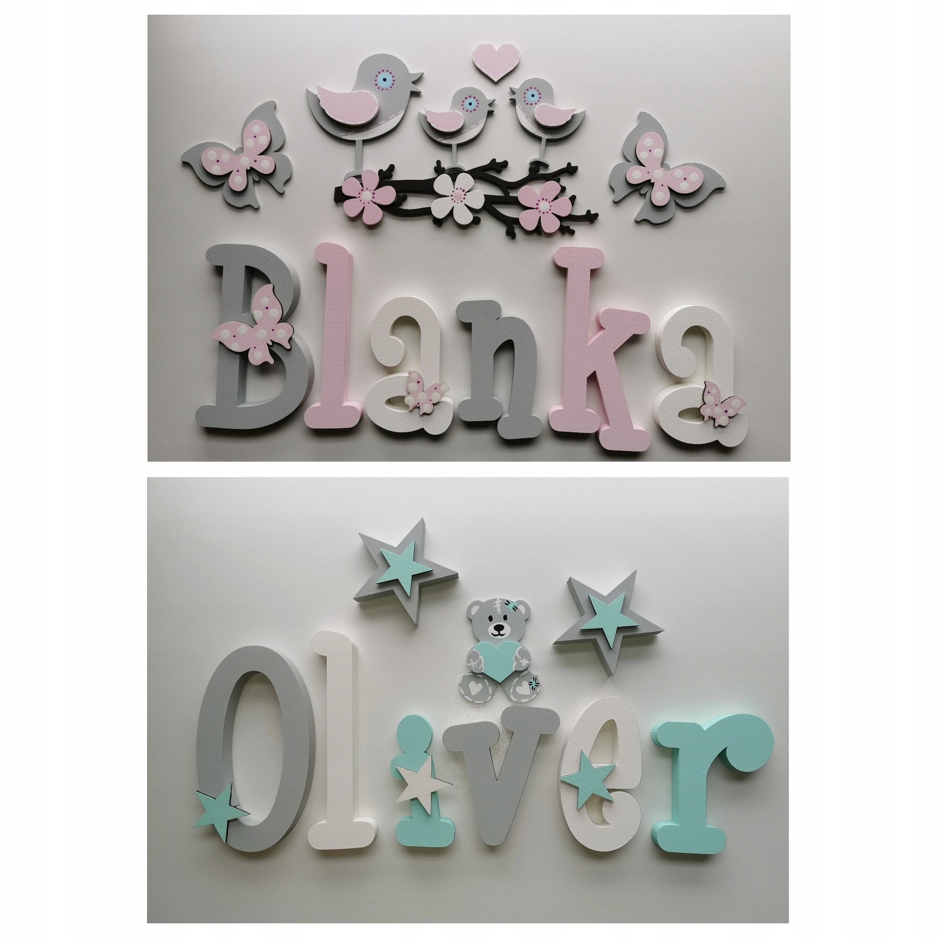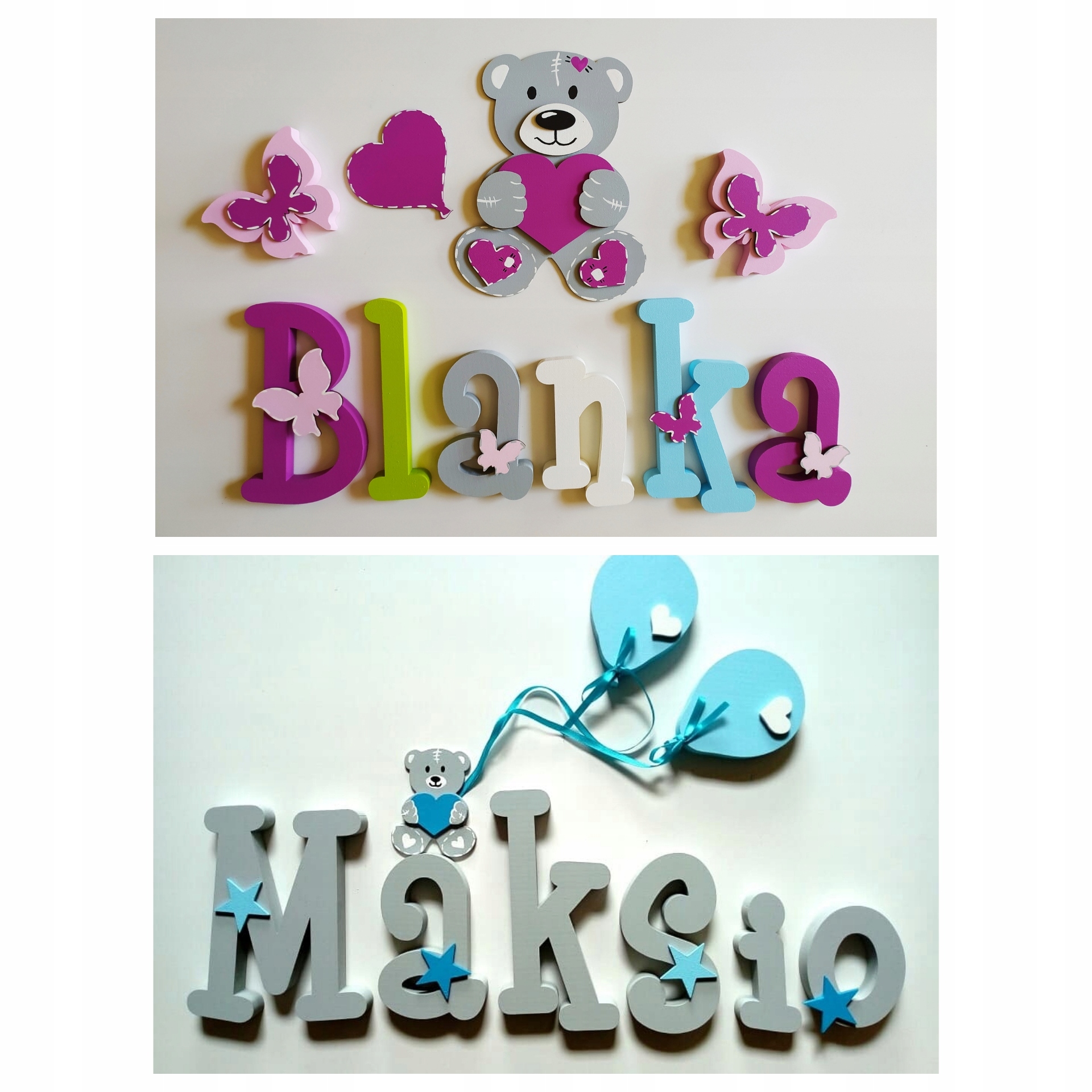 В продаже имеются красивые, расписанные вручную и украшенные ажурными фанерными украшениями-буквы, из которых можно составить имя вашего ребенка.