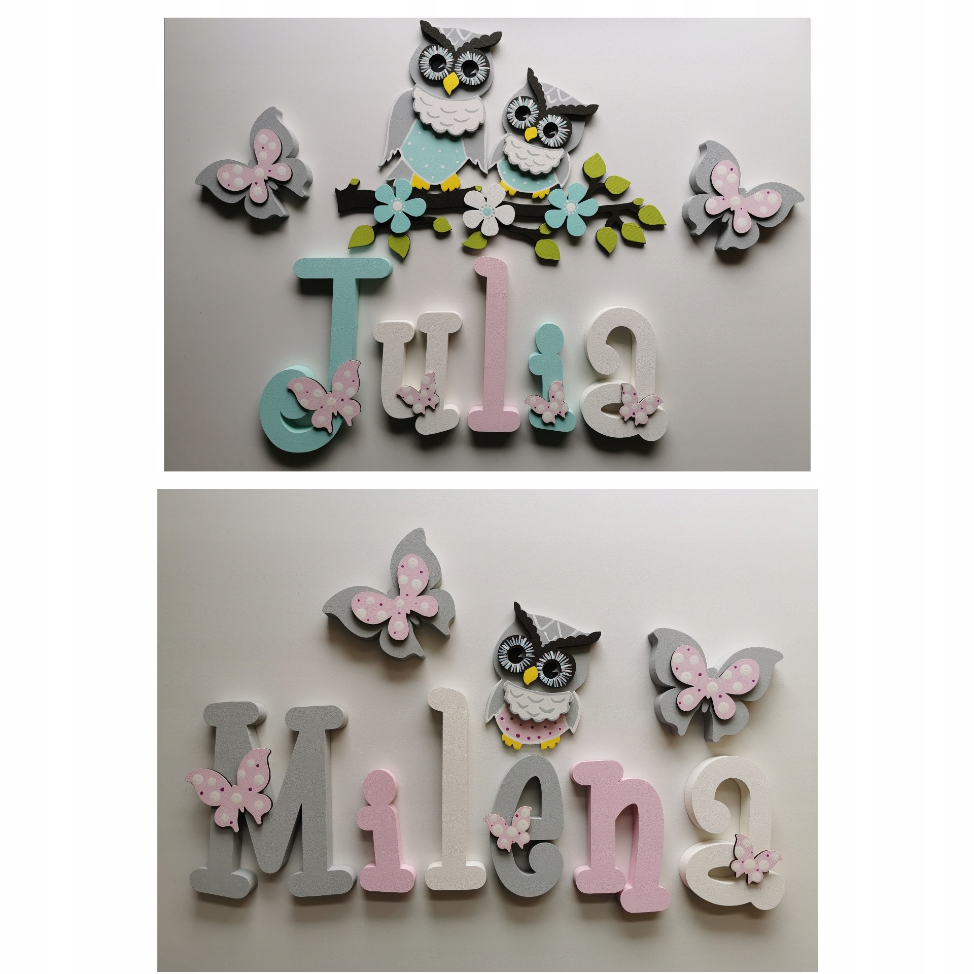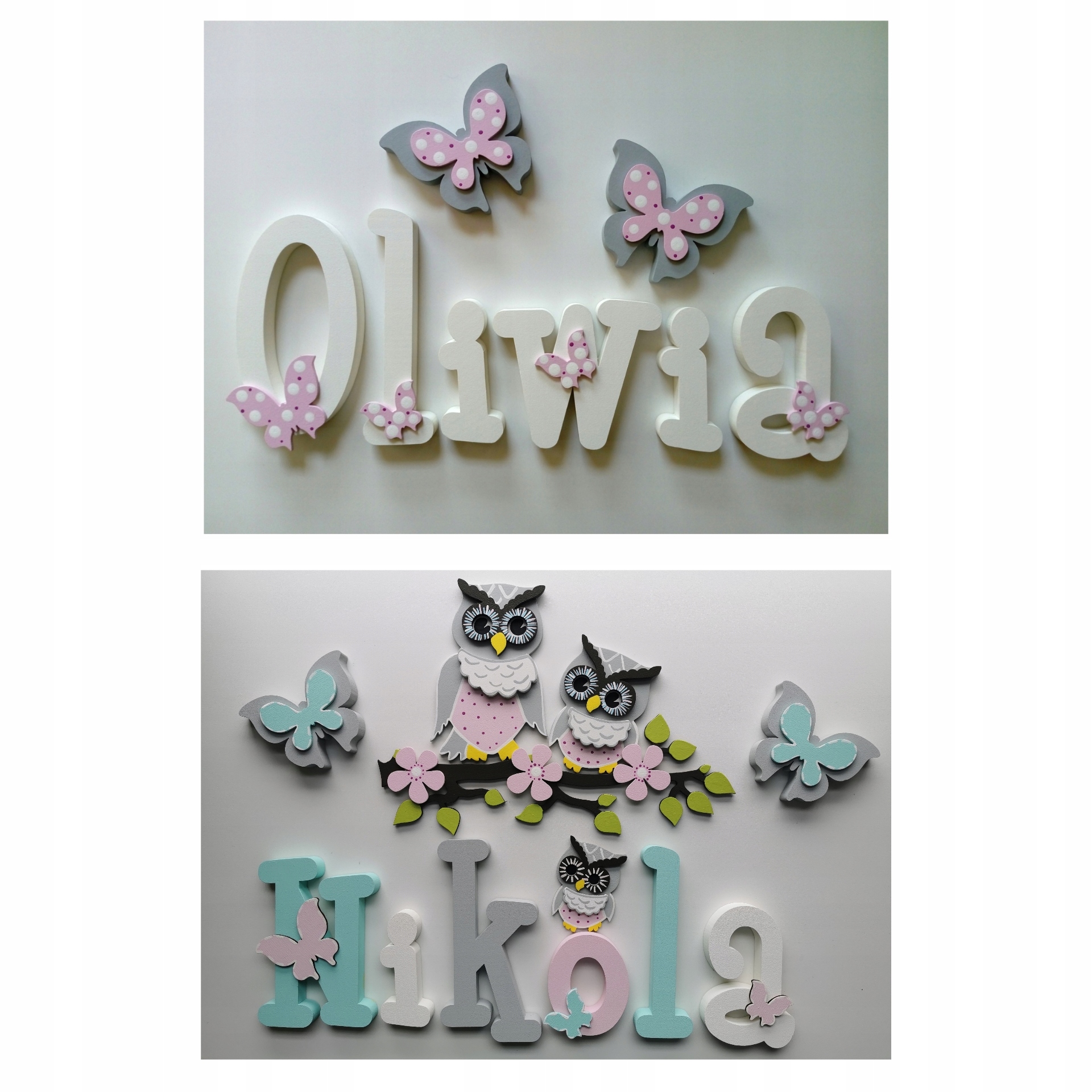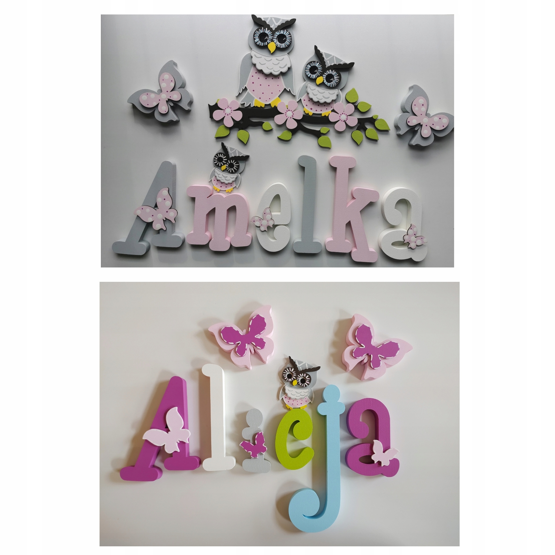 В продаже имеются красивые, расписанные вручную и украшенные ажурными фанерными украшениями-буквы, из которых можно составить имя вашего ребенка.