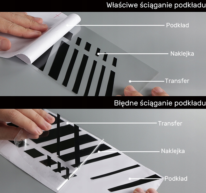 Если у вас возникли проблемы с отделением наклейки от подложки, рекомендуем нажать на всю наклейку и разделить наклейку, как показано на фото ниже.