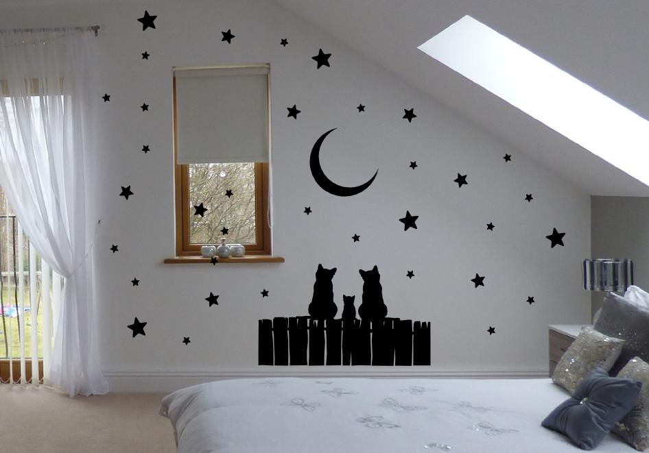 - Количество: наклейка с котами на забор 1 шт, луна 1 шт, звезды 75 шт.