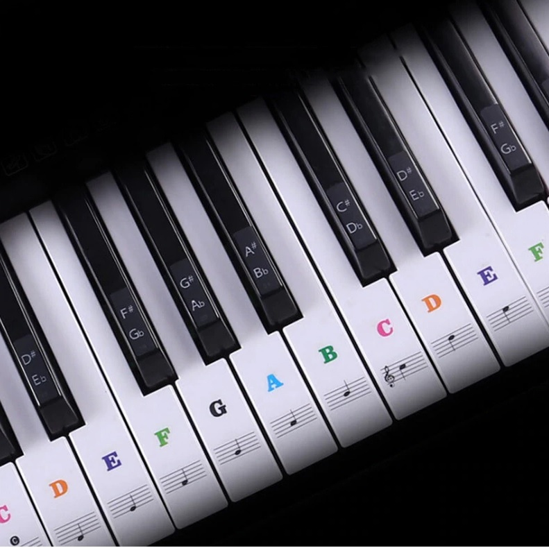 Неоценимая помощь в обучении игре - наклейки с названиями звуков и нот — красочная версия для еще более легкого обучения!