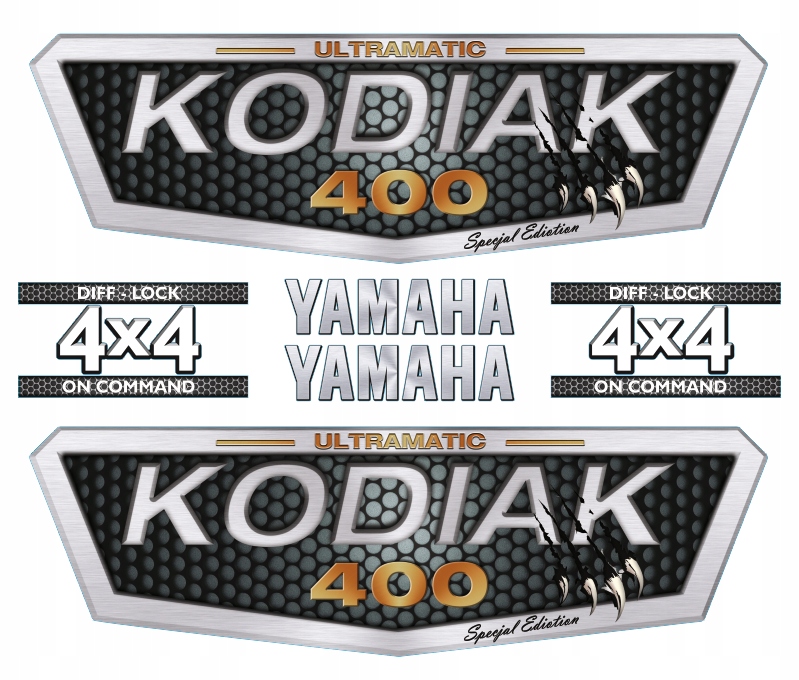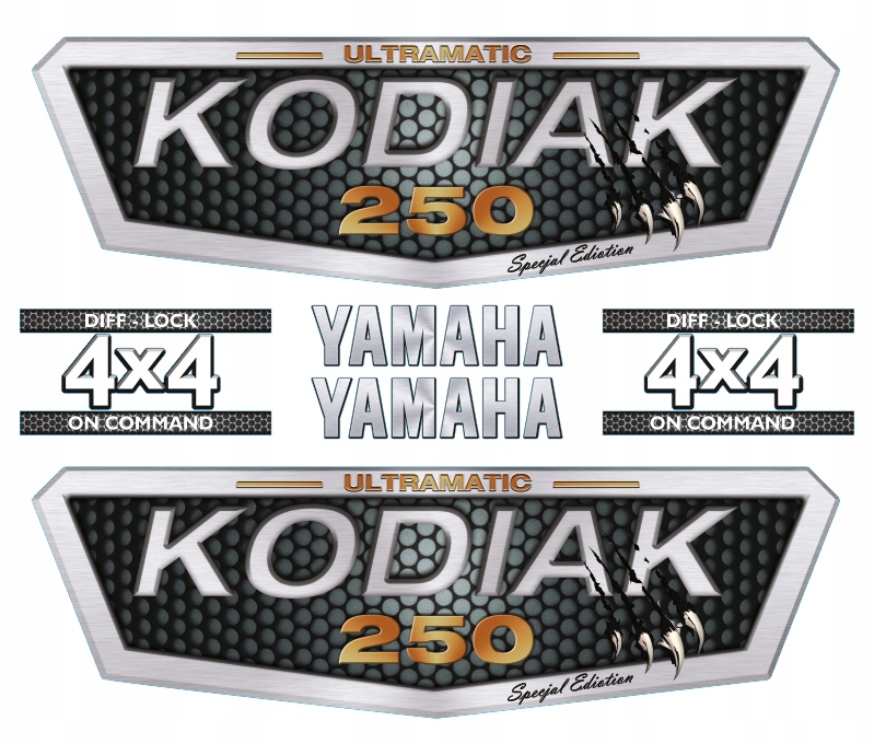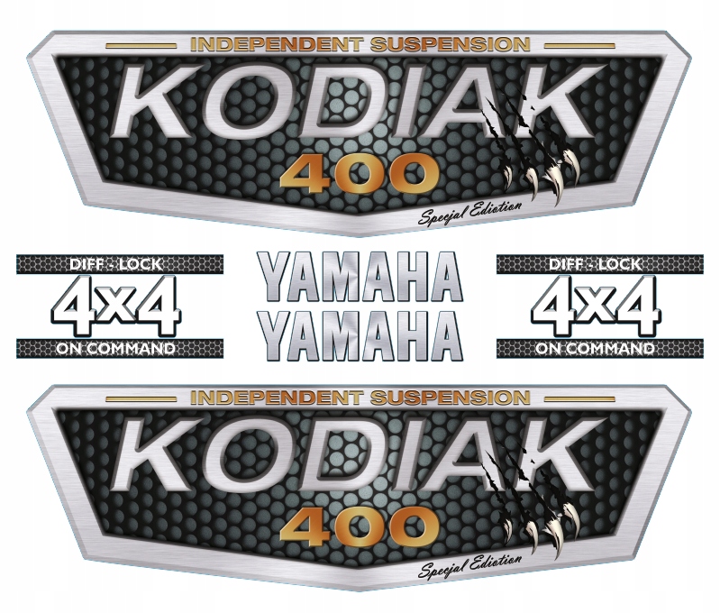 На аукционе представлен комплект наклеек на квадроциклы Yamaha KODIAK. По цене 59 злотых вы получаете один из наборов наклеек размером 35см/35см. Размер отдельных наклеек подобран так, чтобы идеально подходить к квадроциклу. В один комплект входит: 2 большие надписи Kodiak, 2 надписи 4х4, 2 надписи yamaha.