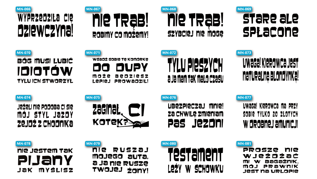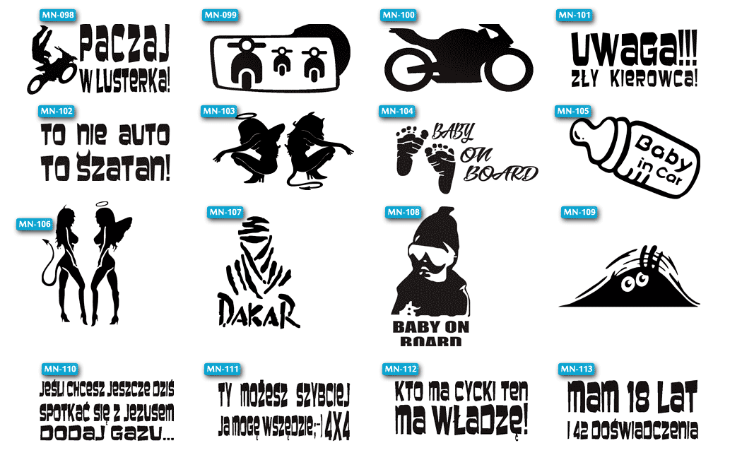 Здесь вы можете купить наклейки с забавными надписями, предназначенными для того, чтобы придерживаться автомобиля (хотя никто не запретит им наклеить их в другом месте;)).