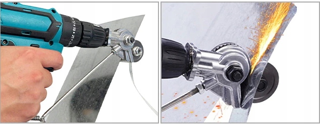 Примечание. В комплект поставки входит только набор (для резки кончик листового металла), а не аккумуляторная дрель.